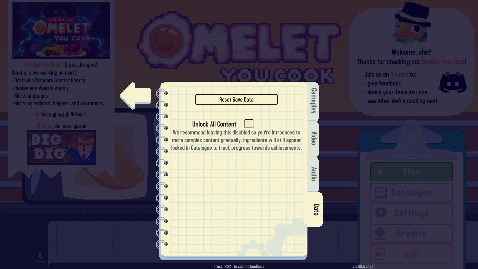 哈咯呀,各位大廚!《你有餅嗎?》 1.0正式版今天上線了!經過7個月、21次內容更新的精心打磨,我們終於可以為大家端上這盤蛋餅啦!今次1.0版本中有甚麼新內容 (≧∇≦)ノ?我們新增了4個初始食材組合,並且在最終食材組合中,你將能夠直面最終Boss:咯咯校長!新版本同樣引入了最高難度"黑色圍裙",使用最終食材組合(咯咯組合)通關劇情後即可體驗。除了劇情內容,我們還優化了一些之前略顯單調的界面:現在每個食材箱都有專屬背景,食材也有了根據稀有度設計的特效粒子。人見人愛的回收小狗現在能更加賣力地幫你消滅食材啦(●ˇ∀ˇ●)!另外還有5位全新小幫手和足足36項新成就,其中一些成就專門為解鎖長線分支末端的食材設計。如果你已經全解鎖了,更新後的首次啟動肯定會彈出一大堆成就。給老玩家的建議:如果你已經玩了很久,或者用過「全部解鎖」功能,我們強烈推薦你在開始1.0之前重置一下存檔。這樣能獲得完整的新鮮體驗。當然,你隨時可以用重做後的"全部解鎖"功能——現在它不會破壞你的進度,還能繼續解鎖成就。搶先體驗期間的數據回顧我們真的無法用語言形容搶先體驗階段對我們來說有多重要。下面是一些讓我們無比激動的數據:664條評測,99%好評率連續111天、507條好評後才出現第一條差評!銷量突破15,000份願望單超過40,000(發售前我們才2,500!)Discord社區成員1,346人,還在持續增長我和Hjalte在搶先體驗期間拚命工作,因為我們真的熱愛這款遊戲,也喜歡看到你們玩得開心。我們平均每月推出 3 次內容更新!這 21 次更新裏我們加了:回合模式(最初只有綠色圍裙是靜態傳送帶)無盡模式局內存檔每週挑戰墊底、黃金、發霉、黏粘、扭動等標籤圖鑑系統92種新食材46位新小幫手40位新顧客8個新起始食材組合(還有25個每週食材組合,持續更新中)80項成就Steam Deck官方認證中文、日語、韓語、泰語本地化數不清的遊戲體驗優化、視覺音頻優化和bug修復雖然上面的乾貨滿滿,但卻只是開始!接下來我們確定添加的內容包括:可自定義/隨機起始食材組合、任意重玩每週挑戰的功能,當然還有更多食材、小幫手和顧客。我們也在和社區一起推進更多語言版本的本地化!肯定還有一些bug和可以改進的地方。歡迎加入我們的Discord,告訴我們你希望看到甚麼內容!新遊戲預告:BIG DIG!我們還很高興地宣布下一款遊戲正在製作中!它源自我們8月做的一個遊戲jam作品,會是個可愛的小項目,同時我們會繼續更新《你有餅嗎?》。如果你喜歡這款遊戲的角色和氛圍,或者想支持我們,請把它加入願望單吧!感謝每一位廚師的支持——你們的好評、反饋、平衡性討論、創意建議,都讓我們感動。我們對這個社區充滿感激。1.0版本會讓更多人認識這款遊戲,我們會繼續打磨它的獨特之處。感謝你們一直陪我們烹飪蛋餅!快來Discord告訴我們你對1.0的想法吧!祝烹飪愉快!-Schu和Hjaltev1.0完整更新日誌新內容3 個新起始食材組合1 個最終劇情食材組合黑色圍裙難度5 位新小幫手(包含 3 位神話稀有度)36 項新成就平衡性調整排行榜全部重置,開始重新衝榜吧!回收時食材數由 3 個上調至 5 個紅/黑色圍裙難度中,花1塊錢隨機到3個要保留的食材實在太難頂了,現在你能更穩定地扔掉真正想扔的食材,少虧些錢。回收時食材庫的數字不再減少老玩家可能一開始會困惑,但這樣看起來更直觀「全部解鎖」改成非徹底切換,可以隨時開關,不影響各位大廚正常解鎖和獲得成就的進度我們還是推薦正常遊玩,以逐步解鎖內容,但假如你想要一口氣體驗所以內容就沒事啦圍裙難度重做藍色圍裙改成"最多獲得 1 次加料次數"(不再是"無免費回收"),回合數從 9 增加到 12 回合測試發現無免費回收難度過高,所以改至紅色圍裙紅色圍裙的小幫手上限從12降到8所有以上調整(與黑色圍裙的加入),都是為了讓每個圍裙難度變得更加獨特。例如有些玩家覺得紅色圍裙限制太多,於是現在藍色圍裙更接近之前的體驗了。這些改動主要針對想挑戰的自身大廚,並在同時保留低難度的輕鬆體驗。無盡模式的數據現在也計入圖鑑統計和解鎖進度之前有大廚困惑:「為甚麼我在無盡模式用菠蘿拿了 100 分,可在圖鑑還是一分沒有?」遊戲裏有說明但不夠清楚,乾脆改成大家預期的樣子前 3 回合不會出現發霉機制發霉顧客的發霉觸發概率從 40% 降到 35%新增食材計分教程 + 其他小教程優化美術更新新增桑尼動畫垃圾界面重做每種食材箱在選食材時都有獨特背景食材箱、小幫手、食材選擇的新粒子特效黏粘新增粒子特效更新了一些早期小幫手的美術「加工」的標籤圖標更新新增無盡模式失敗時的咯咯校長台詞新增出售小幫手時的視覺特效新增離職補償包的動畫龍蝦鉗跟隨滑鼠的動畫更自然了致謝界面重做音效新音樂,每個顧客特性都有專屬BGM!愚人金新音效新增選擇傳說小助手的音效新增失去金錢或被惡霸欺凌時的音效更好地閃電音效補充了部分按鈕與切換菜單標籤的音效本地化新增中文、日語、韓語、泰語、繁體中文支持我們馬上會和社區一起做更多語言版本,歡迎來Discord參與!Bug修復修復了存檔數據可能被刪除的bug修復了過渡到商店時遊戲可能卡住的bug修復了廚師可以從回收界面偷取食材的bug修復了神祕USB的bug,使其效果與描述一致修復了任何玩家完成任意遊戲時,都會獲得每週挑戰成就的bug修復了包裝食材不會在煎蛋餅