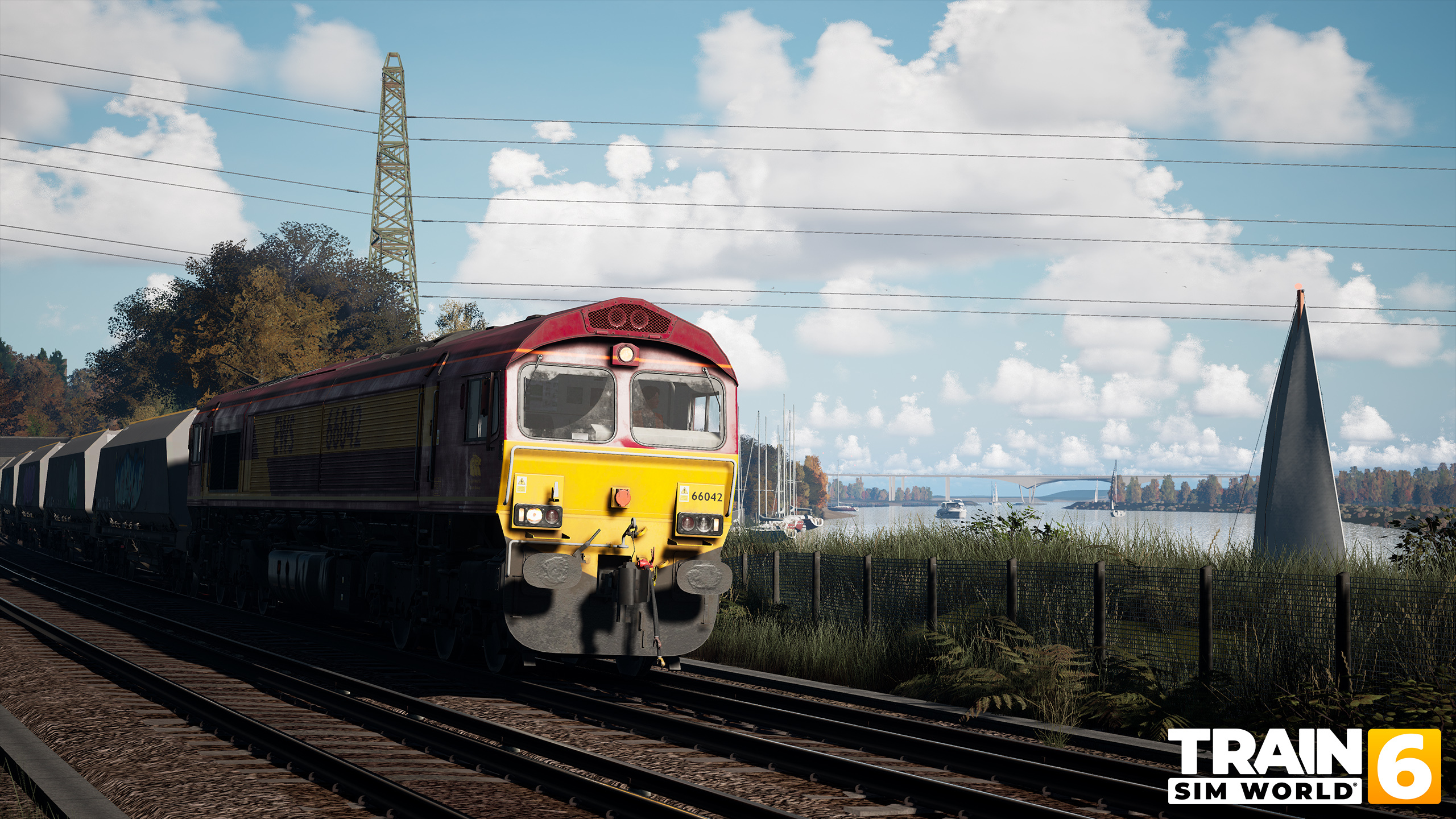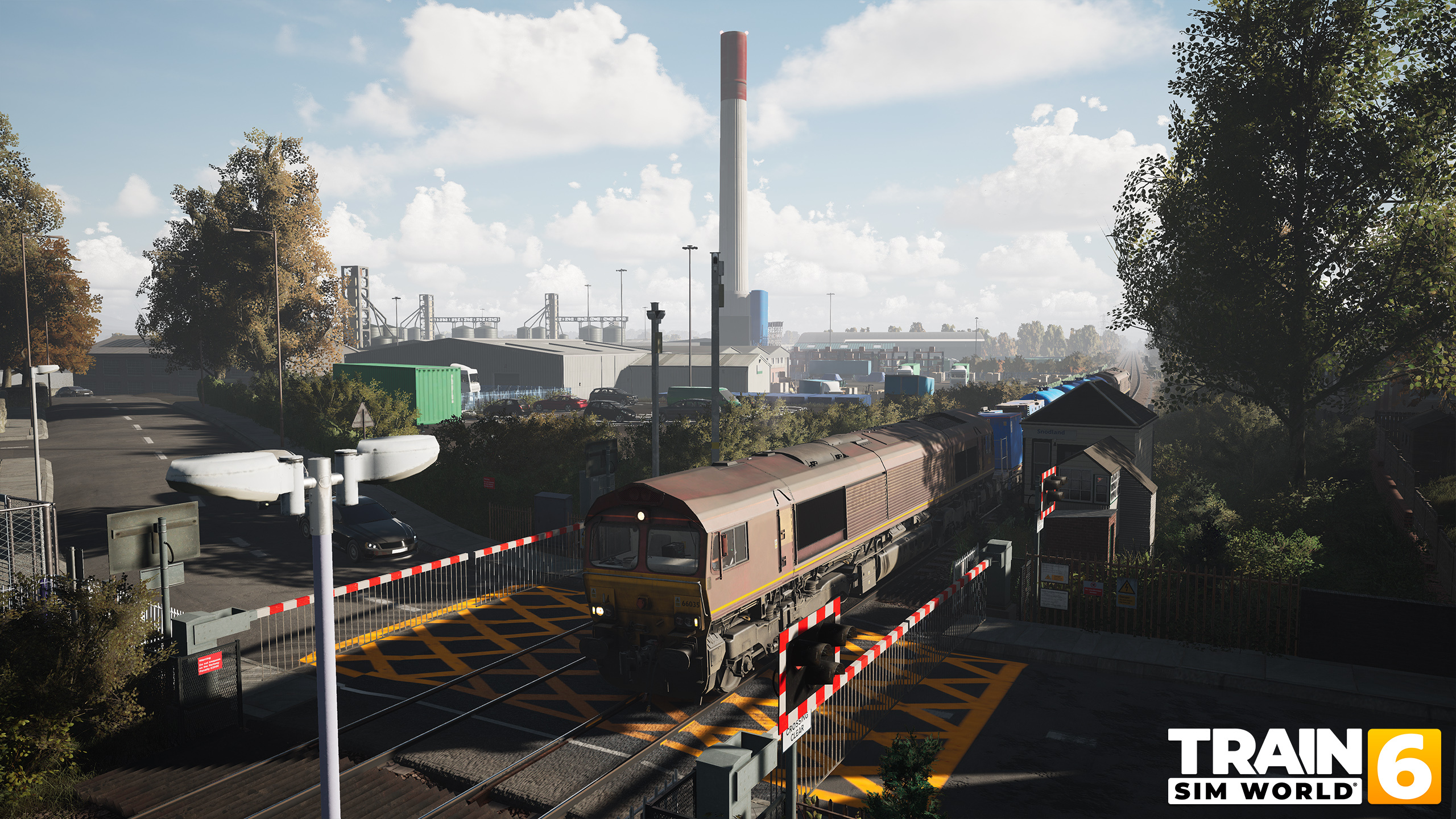 As the line bends around the curving and widening river, a brief clearing offers a view of a landmark we’ll pass under shortly, but also here is access to Halling Marina via a manually operated crossing. Featured as fast travel point for a bit of spotting, the crossing here features working lights and alarms just like a standard crossing, informing any potential crossers whether it’s safe to cross or not. Now would be a good time to call out that supporting AI trains will sound their horns appropriately at every whistle board, (and there are a lot of whistle boards!), so you’ll know when a train is approaching.