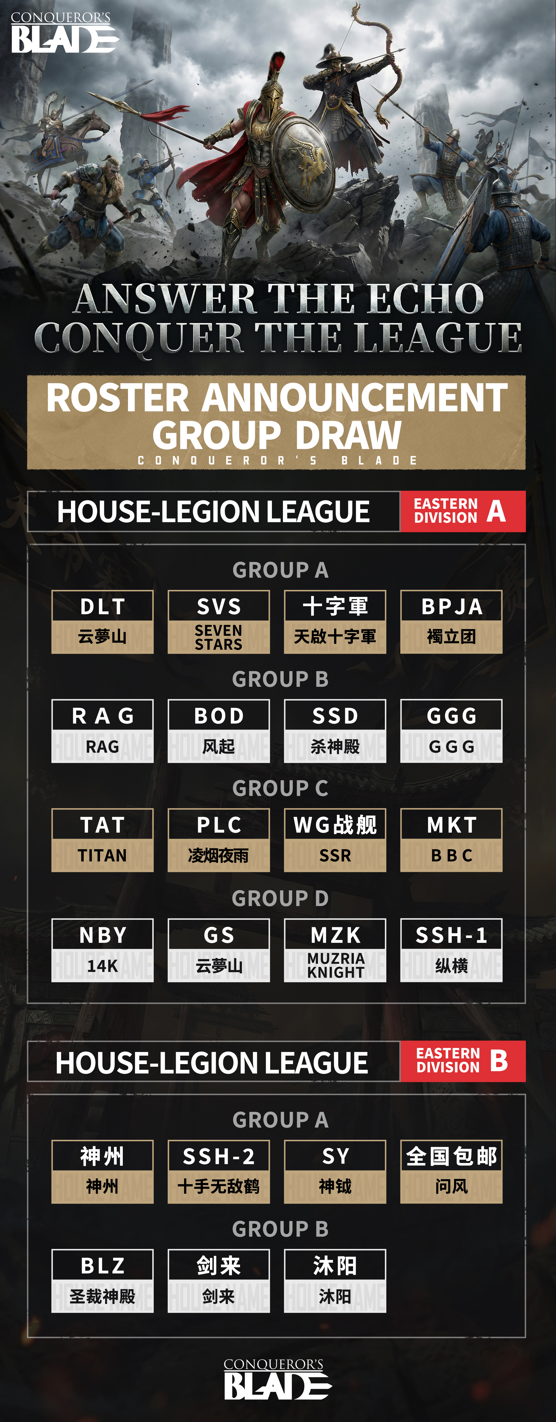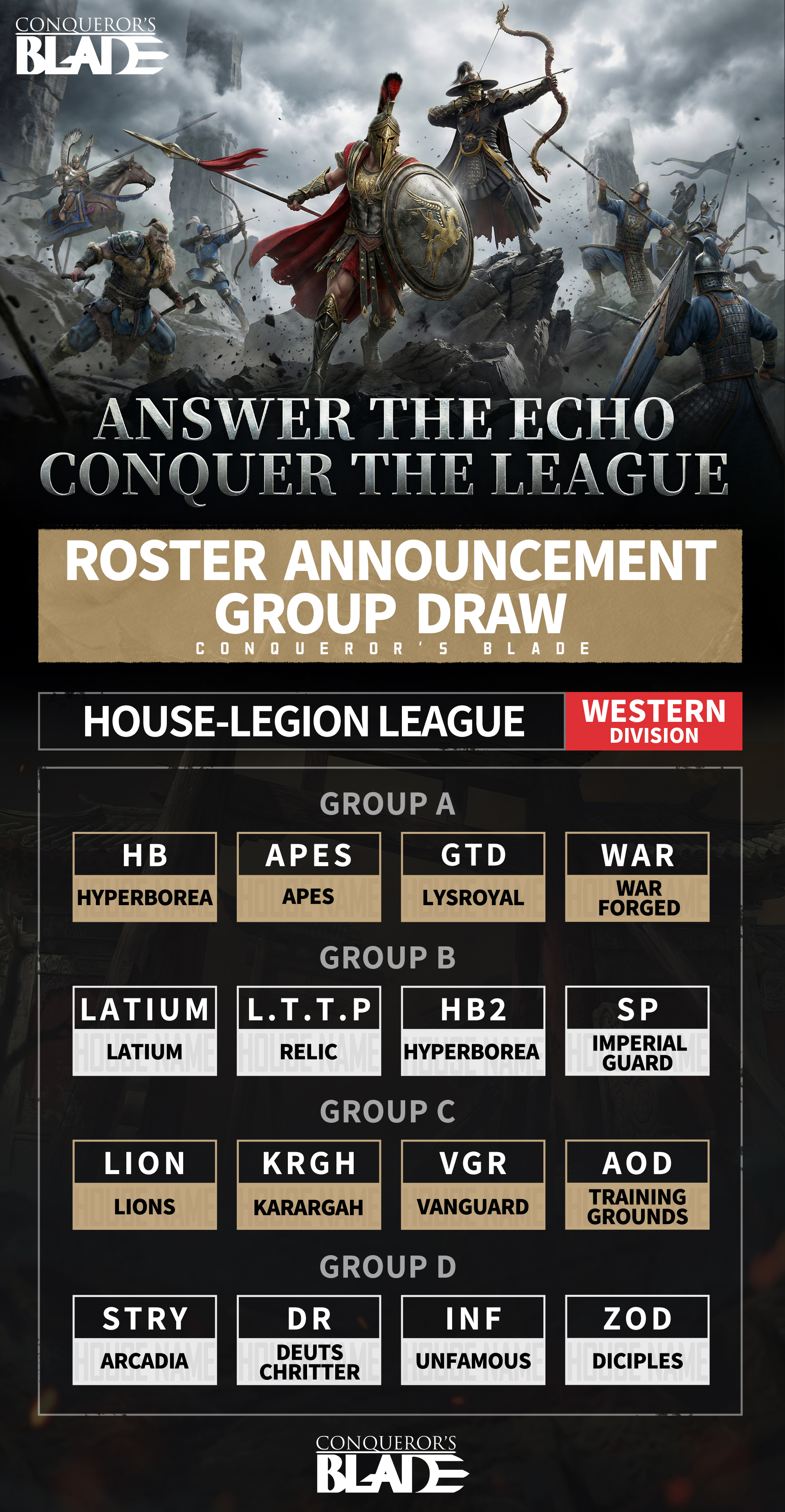 Greetings, Warlords.Following the verification of registrations and points, the participant list and group draw for the 2026 House-Legion League have been finalized.Group ListEastern Division:Western Division:All qualified Houses have now advanced to the next stage. Please ensure your House is prepared for the upcoming matches.Upcoming Schedule & RemindersWith the groups finalized, the Points Stage will commence according to the official Schedule. Please compete within your assigned groups and adhere to upcoming match schedules. Detailed match times, matchups, and administrative notices will be published via official announcements and the tournament group. House Leaders are advised to monitor these channels closely to ensure timely receipt of match notifications and critical updates.Top 8 Draw RulesFollowing the Points Stage, the first round of the Top 8 Knockout Stage will be seeded based on group standings. To reward Points Stage performance and prevent immediate rematches, the draw will follow these rules:1st-place teams will not be matched against their own group's 2nd-place team or any other 1st-place teams.All other matchups will be determined by a random draw.This system ensures that Points Stage rankings are meaningful while maintaining fair and exciting Knockout Stage matches.Once the Top 8 is confirmed, the tournament committee will announce the Knockout Stage draw schedule, detailed procedures, and final brackets.Please stay tuned for further updates.Thank you to all registered Houses for participating in this League.All Schedules, rule updates, and Knockout Stage details are subject to final official announcements. Please follow our official channels for more information.See you on the battlefield!