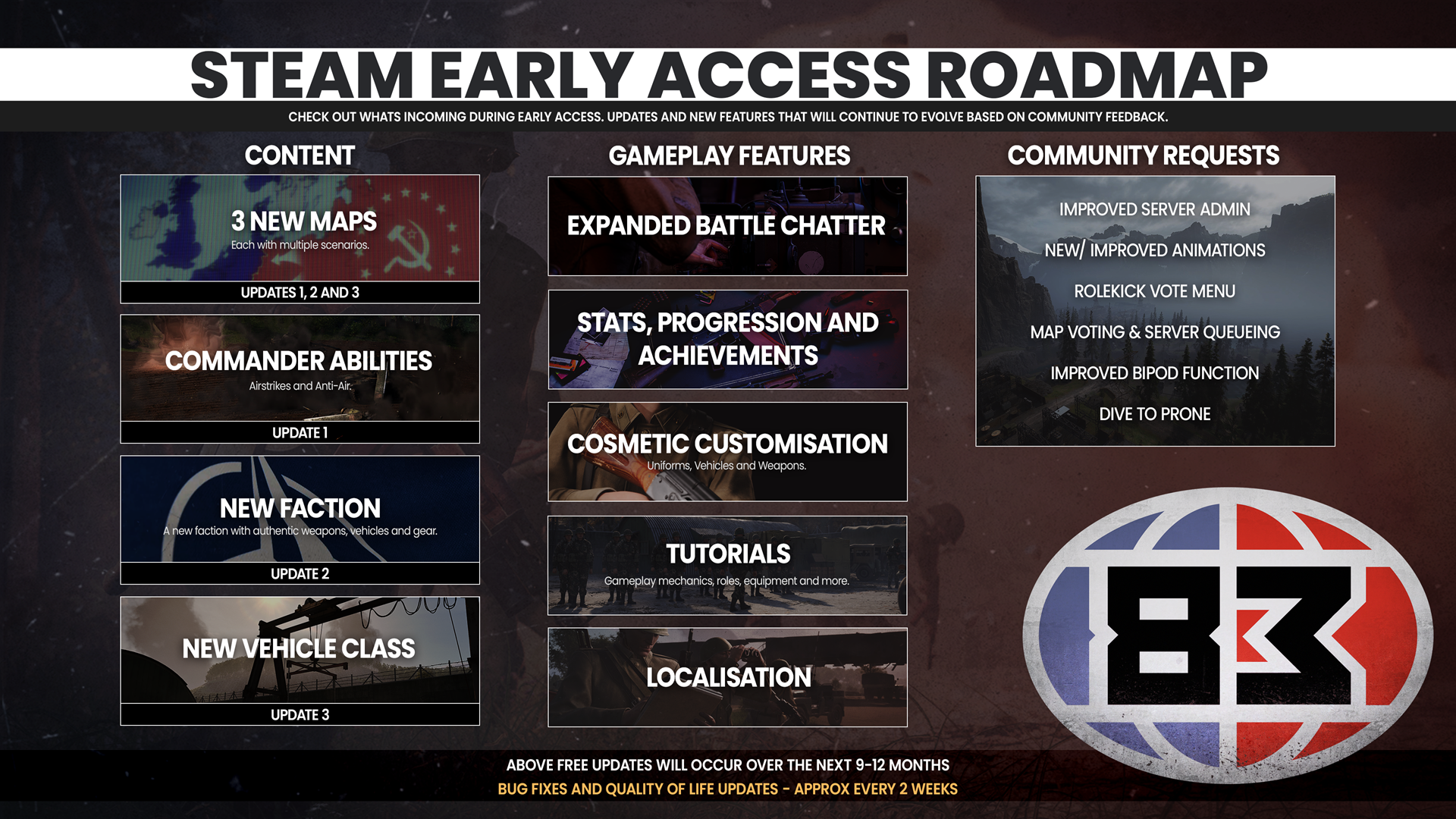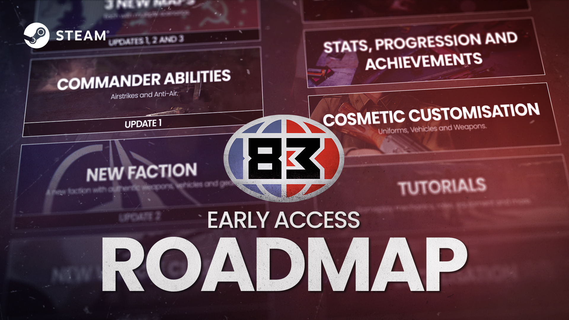 ’83 is out now in Early Access! Jump into the unforgiving battlefields of our Cold War Gone Hot vision of 1983 today. We look forward to hearing your thoughts, comments and feedback on what we've built so far and where you’d like to see development focus next. Early Access RoadmapOur Early Access release is only the start, and today we are also sharing our initial roadmap outlining our current development plans during the Early Access phase. We believe it's important to provide players a transparent overview of our current development plans, so they have a better understanding of what they're buying into, and an opportunity to give feedback as to whether our current priorities align with the wishes of the community. The roadmap will continue to be refined based on player feedback as we move closer to full release. Community Server PartnerWe're also very excited to have secured Nitrado as our launch day partner for community servers - allowing you to rent your own server in '83 and customize it to your desire to fit the playstyle of your friend group, clan or similar. Rent your own server today at: https://nitra.do/83-gameFollow Us on Social Media!Make sure to support & follow us on social media and wishlist us below for more updates! Discord: https://discord.gg/83thegameTikTok: https://www.tiktok.com/@83thegame Instagram: https://www.instagram.com/83thegame/BlueSky: https://bsky.app/profile/83thegame.bsky.socialYouTube: https://youtube.com/@itsnotreditsblueTwitter (X): https://x.com/83thegameFacebook: https://www.facebook.com/83TheGame/Buy '83 Today!https://store.steampowered.com/app/1059220/83/