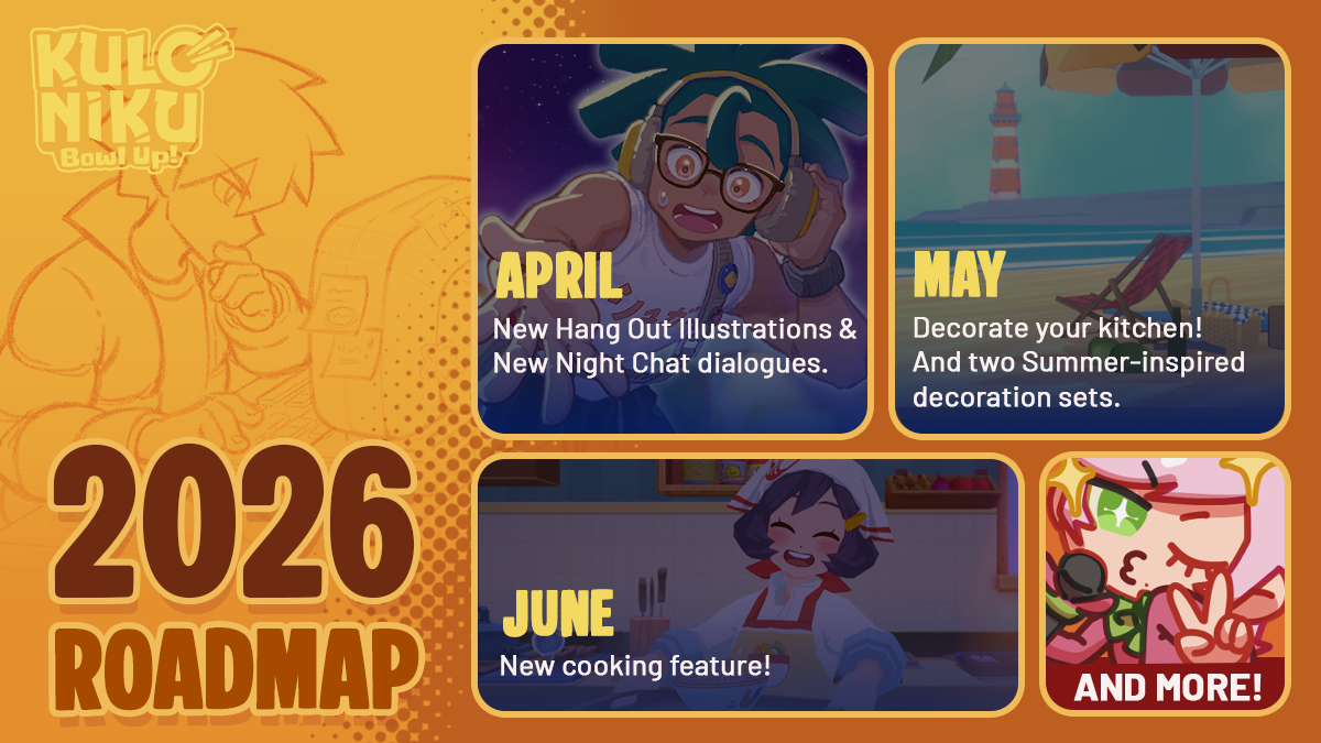 Hi, Chefs! Thank you so much for your overwhelming support for KuloNiku: Bowl Up! We are truly touched by your kind words, reviews, posts, content, fan arts, and streams! It’s beyond our imagination and makes us feel as warm as a bowl of soup!Some of you have asked if we will have patches and content updates in the future. And we’re happy to confirm: yes! We will support KuloNiku as long as we have enough players who want to support us! Your support allows us to continue working on the game.Our first patch will come out on Tuesday, April 14. It will contain fixes for bugs and typos, optimization, and improvement for the borderless window mode!Then you can expect our first content update in the second half of April. It will add new Night Chat dialogues and five new illustrations, one for each Bond character. You can unlock these illustrations – alongside new scenes – by inviting your friends to the right Hang Out spot. We’ll also include small fixes and improvements to make the game play even better.Next, in May, we will launch another free update featuring two new decoration sets! This free update will add two complete sets of fresh, stylish decorations to help you welcome summer in style.To go with your dining area decoration, you’ll be able to decorate your kitchen! You’ll spend the most time there, so it’s time to make it uniquely yours!Additionally, we’ll also improve the Journal – allowing you to view the list of items you have and the ones you can unlock.But that’s not all! In June, get ready for our biggest update yet! This new addition will bring your cooking to the next level and test your skill as a chef. Stay tuned for more information.Help us shape the future of KuloNiku by filling this survey. Let us know what YOU want in the game, and we might just add it.Don’t forget to join our DISCORD to mingle with other chefs and share your restaurant stories.For now, we’re going back to the kitchen to cook up the next update – until later, Chefs!