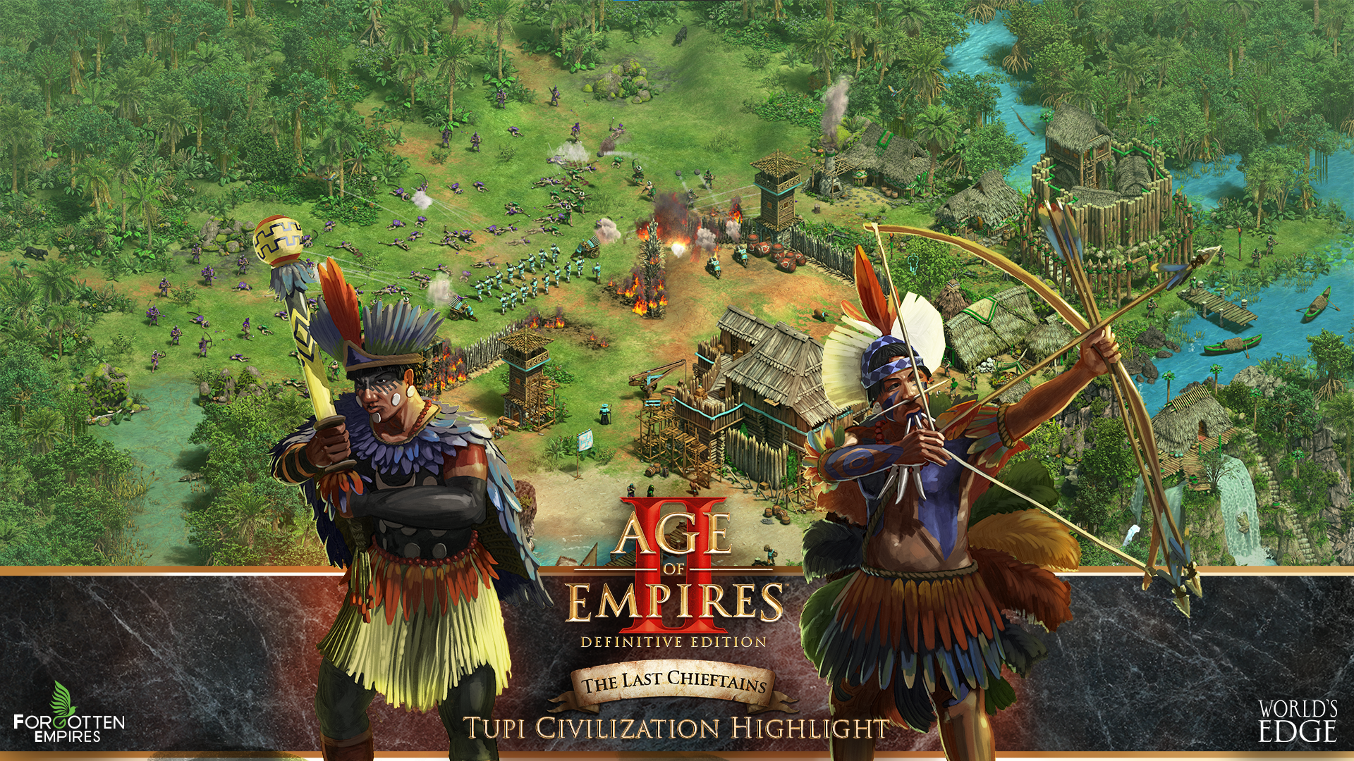 The bold, honorable Tupi prowl the eastern jungles, escarpments, and coasts of South America with formidable warbands of infantry and ranged soldiers. Wide geographical distribution grants them easy access to a variety of resources, while prudent frugality promotes sustainable use of arms and armaments. As foreign arrivals reshape the internal and external tribal relations, the Tupi trust in their large numbers and skilled diplomacy to endure whatever adversity comes their way.BonusesStart with additional resources.Villagers can garrison in Settlements.Fallen units return a percentage of their cost.Archery Range and Barracks upgrades cost less food.Team Bonus: Towers and Castles provide extra population space. Unique UnitsBlackwood ArcherTupi bows were usually made with blackwood and were larger than traditional European bows. The Tupi sometimes made flaming arrows by tying cotton to an arrowhead, dipping it in wax, and then igniting it. They also created poison arrows by using stingray spines as arrowheads.Blackwood Archers are inexpensive and train in pairs, allowing armies of them to be fielded extremely quickly.Ibirapema WarriorWhile Tupi bows were multifaceted weapons, the ibirapema was imbued with ceremonial significance. It was decorated with feathers and colorful paint, and used in ritual killings of enemies. The Tupi also deployed ibirapemas in close combat situations.These hulking heavy infantry units swing a massive club at enemies, dealing area damage.Unique TechnologiesCaciquesThe cacique was the chieftain of an indigenous tribe. These charismatic leaders boosted the morale of their warriors and took charge of their tactical movements on the battlefield.Effect: Champi Warriors and Slingers attack faster.CurareCurare is a plant-based poison historically used to tip weapons and projectiles throughout much of Central and South America. Depending on quantity and concentration, the poison can cause weakness, local paralysis, and even asphyxiation.Effect: Foot archers and fortifications deal poison damage over time.Tupi CastleTupi WonderPre-Order Now!Dive into medieval South America with The Last Chieftains. Available for pre-order now on Steam with 15% off for a limited time!https://store.steampowered.com/app/3219700/Age_of_Empires_II_DE__The_Last_Chieftains/