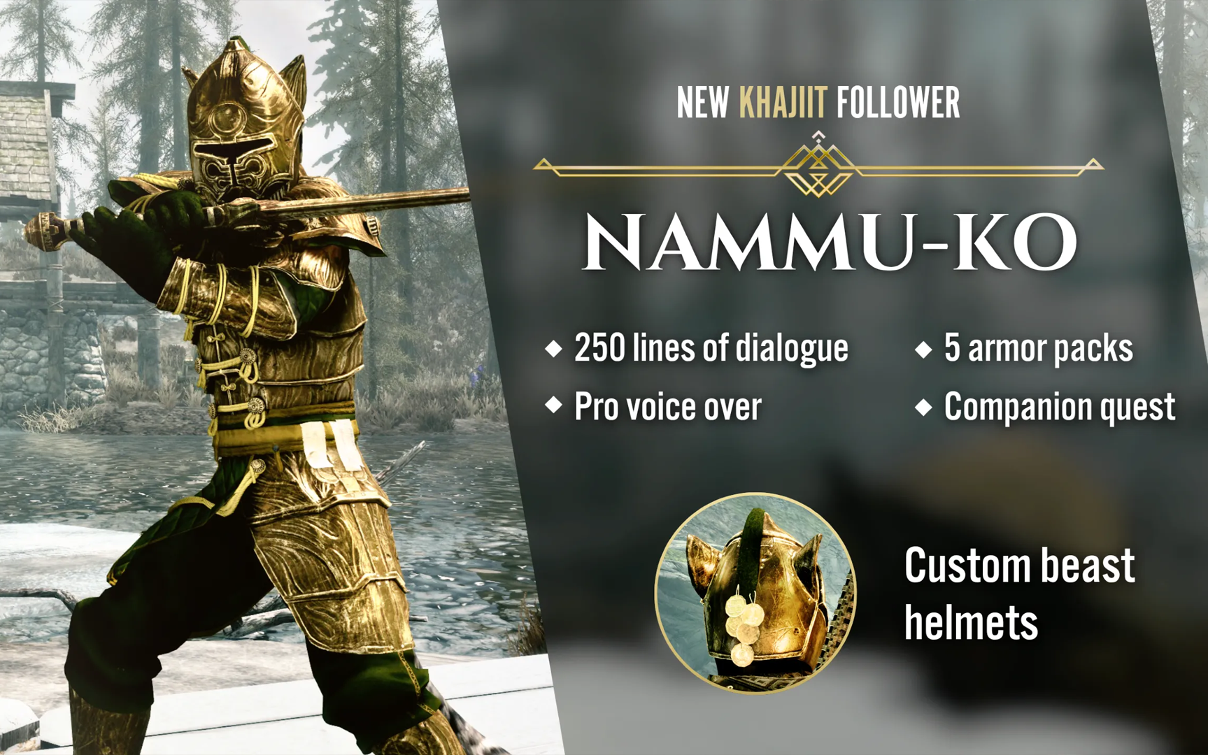 Seek out and recruit Nammu-ko, an honorable Khajiit mercenary currently lodging at the Bannered Mare. She and many other Defenders of Hla’ruhn - a bustling trading town in the Sea of Ghosts - have journeyed to Skyrim in hopes of aiding in the fight against the dragon menace. Claim five glorious new sets of armor of Hlaalu craftsmanship, and uncover Nammu-ko’s hidden past!