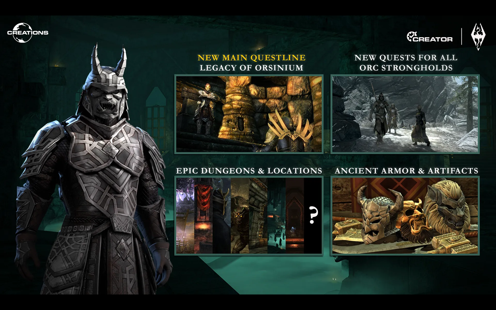 Legacy of OrsiniumBy VeelpootNew adventures await from the creators of Lordbound! Prove your worth to the Agra Crun, as the might of Orsinium descends upon a humble stronghold. Travel through the expanded mines of Mor Khazgur, inspired by the events in The Elder Scrolls Online and uncover the secrets of a long-forgotten Orcish tomb.Legacy of Orsinium: A new professionally-voiced storyline with multiple endings for the Orc stronghold of Mor Khazgur!Orc Strongholds Quests: new side quests for all Orc strongholds: Narzulbur, Dushnikh Yal and even Largashbur!Armors & Artifacts: unique items & quest rewards inspired by the Orsinium DLC from The Elder Scrolls Online.Epic Dungeons: new dungeons made by veteran modder RoKMod, best known for his dungeons in Lordbound and Children of Ug-Qualtoth.Defenders of Hla’ruhnBy MysticMadmanSeek out and recruit Nammu-ko, an honorable Khajiit mercenary currently lodging at the Bannered Mare. She and many other Defenders of Hla’ruhn - a bustling trading town in the Sea of Ghosts - have journeyed to Skyrim in hopes of aiding in the fight against the dragon menace. Claim five glorious new sets of armor of Hlaalu craftsmanship, and uncover Nammu-ko’s hidden past!Five beautifully crafted armor sets of traditional Hlaalu design.A fully voiced Follower, Nammu-ko, featuring an emotional character arc.Fourteen newly added Defenders of Hla'ruhn, hand-placed throughout Skyrim.Aetherspire CastleBy PrincessMelyJourney on a quest to explore the mysterious castle that has suddenly appeared in the sea of ghosts, in Skyrim’s far north. Meet new characters, discover hidden treasures, and claim Aetherspire Castle as your own, in this new mystical experience.Aetherspire is a full-fledged player home complete with an alchemy garden, throne room, training rooms, dining room, blacksmiths, library, kitchen, dressing hall, bathhouse, and a master bedroom. Aetherspire also features portals to every major settlement, and many secret items to be found.Thief HideoutsBy: TheRealElianoraA small hideout in every major city (Riften, Solitude, Whiterun, Windhelm and Markarth) for your thief character. They can be accessed through wells in the cities.STATIC CLUTTER - Lydia can't knock over my beautiful decorations and an accidental Fis Roh Dah Unmarked quest to get a key to the homes Teleport markers in each home to quickly travel between different major city entrances (Markarth, Riften, Solitude, Whiterun, Windhelm) A universal "thieves cache" that is accessible from every hideout so you can store all your sellable thief gains into one chest, accessible in every home! The usual benefits of well-rested, follower-friendly, crafting stations, totally respawn-safe containers etc.The Starmade BladeBy: TheLootistHired by the owner of Ironsong Mine, you and a team of three new characters explore the halls of Oioran, an Ayleid ruin hidden beneath the soil and stone of The Rift. Many secrets are scattered throughout the halls of Oioran. Accompanied by the mine owner, his bodyguard and their hired researcher from Cyrodiil, will you be able to find them all? Or will you succumb to the many dangers that await you? Here, you will find a new powerful sword, The Star-Made Blade. Exploring this Oioran, the Ayleid Ruin, you will be given the chance to uncover its secrets. Why are these Ayleids in Skyrim? New enemies that lay waiting in its crumbling halls? And what treasures will you find along the way?Weapon: The Star-Made Blade, a customizable sword which you can tune to any star sign. Changing the Star sign of sword gives you a unique buff while equipped and a appearance, changing the colour of the blade and the gem in its hilt. Power attacks release a unique constellation projectile at you enemies dealing great damage. Dungeon: a large new Ayleid dungeon, containing multiple highly detailed areas with lots of opportunities to explore. Quest: A detailed quest with choices, consequences and lots of reactive dialogue from new characters as you explore the ruins. Optional Objective: Contains an optional objective where you will have to explore extra carefully to uncover the secrets and history of the Ayleid’s who once lived here. To accept this, make sure to Ask Calindil about what the Ayleid tablets say. New Enemies: Ayleid Skeletons clad in Elven armor wait within the depths of the ruins, as well as new unheard-of foes deeper into the ruins. 8 New Summon Spells: 8 new spells that can be found throughout the dungeon allowing you to summon the new enemies added into this Creation. Make sure you explore fully to find them. Boss Fight: A tough new boss fight with new custom mechanics