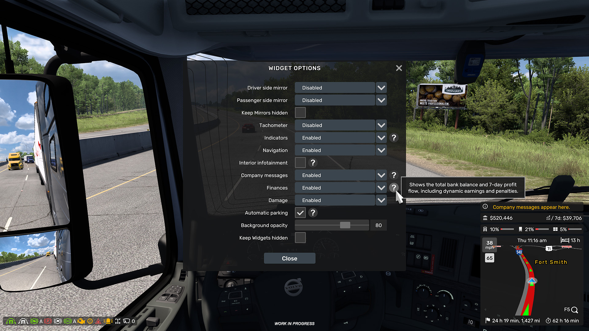 Based on that, we've implemented the Damage and Finances widgets. The widgets are designed to restore easy access to information about truck damage, plus trailer and cargo damage, if you are currently driving with a trailer and cargo, as well as your current bank balance, with an average profit over the last seven days displayed too.