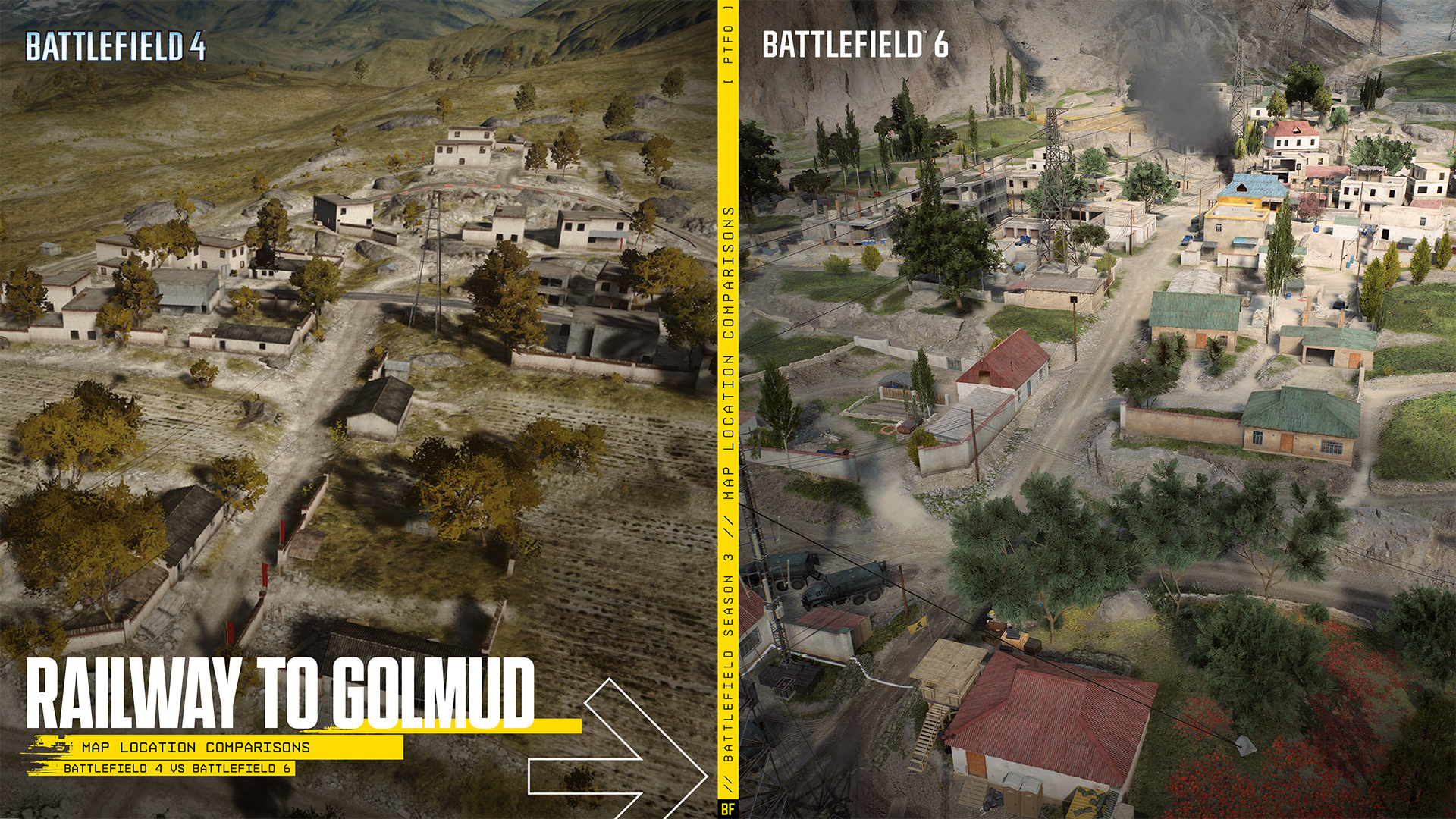 REIMAGINING GOLMUD RAILWAYOriginally released in Battlefield 4, Golmud Railway was the largest map at launch. “We have better technology than we did 13 years ago,” Level Designer Luka Grepl-Malmgren said. “Two of the original level artists of Golmud Railway are still here at DICE, so we all worked together to not only recreate their work, but also understand what was not possible in Battlefield 4 and bring those ideas to life in Battlefield 6.” Featuring land and air vehicles - buggies, tanks, helicopters and jets - Battlefield 4’s Golmud Railway is defined by its train: as those who played Conquest over a decade ago will tell you, once a team captured the train, it moved towards their headquarters. The train also had machine gun turrets as a means of manned defense, while large explosive devices sprinkled around the map created craters or disrupted large ground vehicle movements. In more tactical modes, the village is the focal point: abandoned houses turned into rubble by the end of a Deathmatch or Domination, lest the rooftops be controlled by Recon soldiers picking squads off with a DMR or Sniper Rifle. In Battlefield 6, the Railway to Golmud faithfully improves these moments, starting with the train. Not only does this new railway have several carts with cover, parkour opportunities, and double the amount of engines (one on the end of each train), it also heads towards the enemy headquarters rather towards the headquarters of the team who captured the objective. “We made this change because in most Battlefield 4 matches, the train mainly remained on one side of the map and did not get any gameplay,” Grepl-Malmgren explained. “So, in this version, the train is now easier to capture back, but also the team holding the objective now has a strategic place to spawn and capture the flag closest to their enemy’s HQ.” The airspace is also the largest of any Battlefield 6 Multiplayer map to date. “Jet players can now go around the closest mountain peaks and have dogfights in the valleys and glaciers,” Grepl-Malmgren said. On the ground, veteran players know the pitfalls of “no-mans lands” across Golmud Railway in between major objectives. Inspired by another Battlefield map - Panzerstorm from Battlefield 5 - Battlefield Studios developers have added stone fences, foliage, and other means of protection should a squad have to advance without a vehicle. Ultimately, this means every major point of interest - each Conquest objective, for example - is unique and occluded from the other, meaning controlling one objective does not necessarily mean control over another. To learn more about the changes to points of interests and other major updates, plus our expert 9 tips and tricks, head over to ea.com.