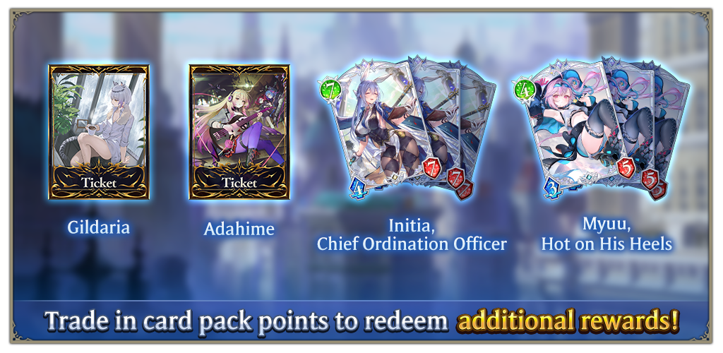 Anathema's Gambit is Shadowverse: Worlds Beyond's seventh card set, with 77 different cards and 2 exchange tickets.In addition, each card you draw has an 8% chance to be a premium card featuring sleek animations.Exchange TicketsOn rare occasions, a card pack may contain an exchange ticket in lieu of a card. The exchange ticket can be redeemed for a Leader Set or other valuable rewards.Each ticket can be redeemed for one set, the lineup of which differs by card set.*An exchange ticket is valid for 180 days, after which it will be automatically redeemed for a random unowned set from its exchange lineup.*Exchange tickets cannot be obtained from the daily free card pack.Card Pack PointsPurchase Anathema's Gambit packs to earn Anathema's Gambit card pack points, which you can exchange for the rewards below. Each pack will get you one point.*Some card packs, including those obtained through the login bonus, will not yield any points.• Gildaria exchange ticket• Adahime exchange ticket• Fully animated copies of Initia, Chief Ordination Officer• Fully animated copies of Myuu, Hot on His HeelsLucky ChestsIf you earn enough card pack points, a Lucky Chest will appear containing a reward chosen at random from those listed above under "Card Pack Points." Note that any exchange tickets that you've already obtained 3 times and fully animated cards you already own will not appear in Lucky Chests.*The draw rates in Lucky Chests will be the same for each eligible reward. The draw rates for exchange tickets and fully animated cards you can no longer obtain will be equally split between the remaining rewards.You will see your first Lucky Chest after accumulating 250 card pack points, which you can then exchange for the reward contained within.After that, chests will appear each time you amass 200 card pack points. If you do not want what a Lucky Chest is offering, you can choose to keep your points and not receive the reward. Also, chests will not appear if you've already exchanged for all the available items.Point ExchangeIf you save up enough card pack points, you can exchange them directly for a reward of your choosing.*If you choose an exchange ticket, you will also need to choose which set to redeem it for.Your first trade will cost 350 points, and will be reduced to 300 points for any subsequent trades. The cost will also drop to 300 if you get your first reward through a Lucky Chest.Once you've traded for every item in the lineup, each time you amass 300 card pack points they will be automatically exchanged for 3 Seer's Globes and 1 Seer's Gem.Notes• Draw rates and other information can be viewed from the Details button on the Buy Card Packs screen.• The Daily Deal resets at 8:00 p.m. (UTC) daily.• Multiple copies of the same card might appear in a single card pack.• Animations might be skipped or play incorrectly when connection issues occur.• Cards are automatically added to your collection whether animations play or not.• Every card's draw rate is independent. A 1%-draw-rate card won't always appear when you draw 100 cards.• Up to three copies of a card can be used in one deck.• The draw rates for individual cards are rounded to the nearest thousandth, so the total draw rates for all cards may not add up to 100%.To celebrate the release of the new card set, Anathema's Gambit, we're giving out a free deck to all players!Log in and choose from 1 of 2 decks!PeriodAfter the April 28 (UTC) maintenance until release of card set #8*Note that the end time for this giveaway will depend on when maintenance to release card set #8 starts.Decks•Earth Rite Runecraft•Midrange AbysscraftNoteDetails are subject to change without notice.To celebrate the introduction of Rotation matches, we are also introducing Intro cards! These cards can be included in decks just like regular cards, making it easier for all players to build powerful decks.Intro cards will be a permanent feature until further notice. To help all players improve their decks, we will be holding the following events, which will include hundreds of Intro cards as rewards!・Golden Week Celebration Special Login Bonus・Intro CampaignIntro CardsIntro cards are exclusive to Intro Card Packs and feature a special Eudie sticker. They have the exact same cost, attack, defense, and abilities as their original versions, so you can add them to your deck and use them in battle just like normal. Plus, your opponents and spectators won't even be able to tell you're using them!*Intro cards cannot be converted to premium cards.*Intro cards cannot be created or liquefied.*Intro cards are not included in the total number of cards held when liquefying.*Intro cards will not be added to your card compendium.*If you own the Intro card version of an adjusted card, you will not receive items as a result of those adjustments.Intro Card PacksIntro Card Packs can only be exchanged using Intro Card Pack tickets. There is a different Intro Card Pack for each card set. You can switch between different