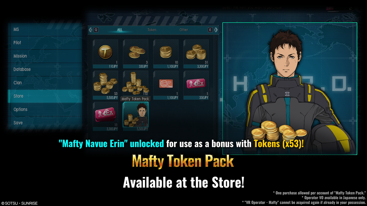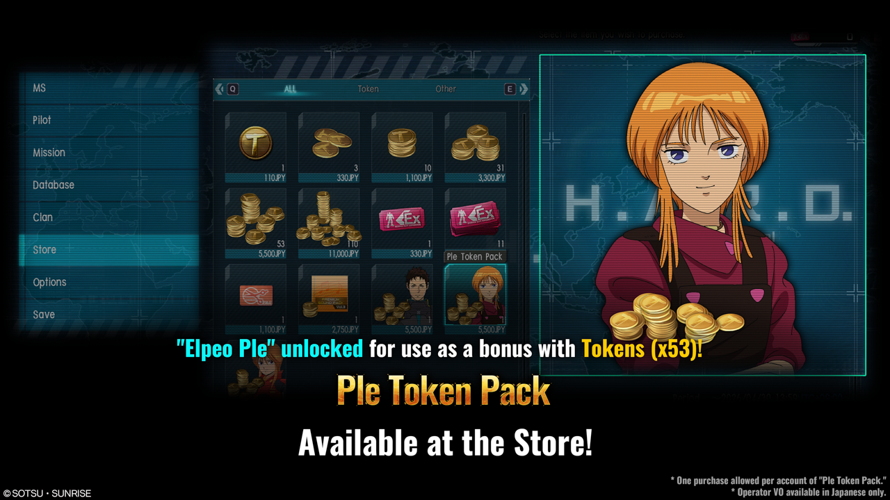 Hello, Pilots!This is the Steam® version "Mobile Suit Gundam Battle Operation 2" team. ■Announcement for Token Pack with MaftyDuring the period, Token pack with 53 tokens and Mafty will be on sale!Token Pack with Mafty is only for $44.99!! ■How to purchase You can purchase the pack at the Store from H.A.R.O. menu. ■Voice samplehttps://bo2.ggame.jp/images/info/2025/01/a7e1a0cc615915956db93796f3f4a702.mp4 ■VR operator Mafty Navue Erin (Voice: Kensho Ono) ■Period [PDT] 04/02/2026 01:00 – 04/29/2026 21:59 [Scheduled] [CEST] 04/02/2026 10:00 – 04/30/2026 06:59 [Scheduled] ※This token pack can only be purchased ONCE per account.※Only Japanese operator voice is available.※Operator can be changed in the menu H.A.R.O.>Options>Sound Settings by selecting the operator. ■Announcement for Token Pack with PleDuring the period, Token pack with 53 tokens and Ple will be on sale!Token Pack with Ple is only for $44.99!! ■How to purchase You can purchase the pack at the Store from H.A.R.O. menu. ■Voice samplehttps://bo2.ggame.jp/images/info/2026/02/0bfbebf5fc06bf31161a57445d84b3b8.mp4 ■VR operator Ple (CV: Youko Honda) ■Period [PDT] 04/02/2026 01:00 – 04/29/2026 21:59 [Scheduled] [CEST] 04/02/2026 10:00 – 04/30/2026 06:59 [Scheduled] ※This token pack can only be purchased ONCE per account.※Only Japanese operator voice is available.※Operator can be changed in the menu H.A.R.O.>Options>Sound Settings by selecting the operator. ■Announcement for Token Pack with Ple TwoDuring the period, Token pack with 53 tokens and Ple Two will be on sale!Token Pack with Ple Two is only for $44.99!! ■How to purchase You can purchase the pack at the Store from H.A.R.O. menu. ■Voice samplehttps://bo2.ggame.jp/images/info/2026/02/5965d5f5693118d3be451e141bbb0052.mp4 ■VR operator Ple Two (CV: Youko Honda) ■Period [PDT] 04/02/2026 01:00 – 04/29/2026 21:59 [Scheduled] [CEST] 04/02/2026 10:00 – 04/30/2026 06:59 [Scheduled] ※This token pack can only be purchased ONCE per account.※Only Japanese operator voice is available.※Operator can be changed in the menu H.A.R.O.>Options>Sound Settings by selecting the operator. The latest information will be posted on STEAM News and our X (Twitter) in the future.https://x.com/pc_gbo2 We look forward to your continued support of "Mobile Suit Gundam Battle Operation 2".