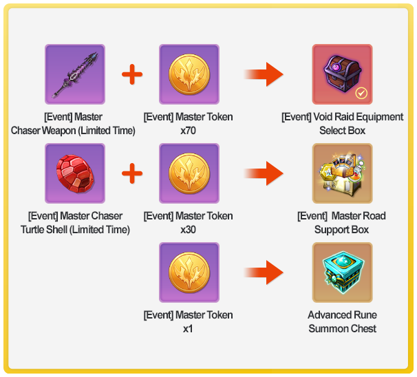 - Players can also exchange ‘[Event] Master Token’ x1 or ‘[Event] Conqueror Token’ x1 for ‘Advanced Rune Summon Chest’ x1.