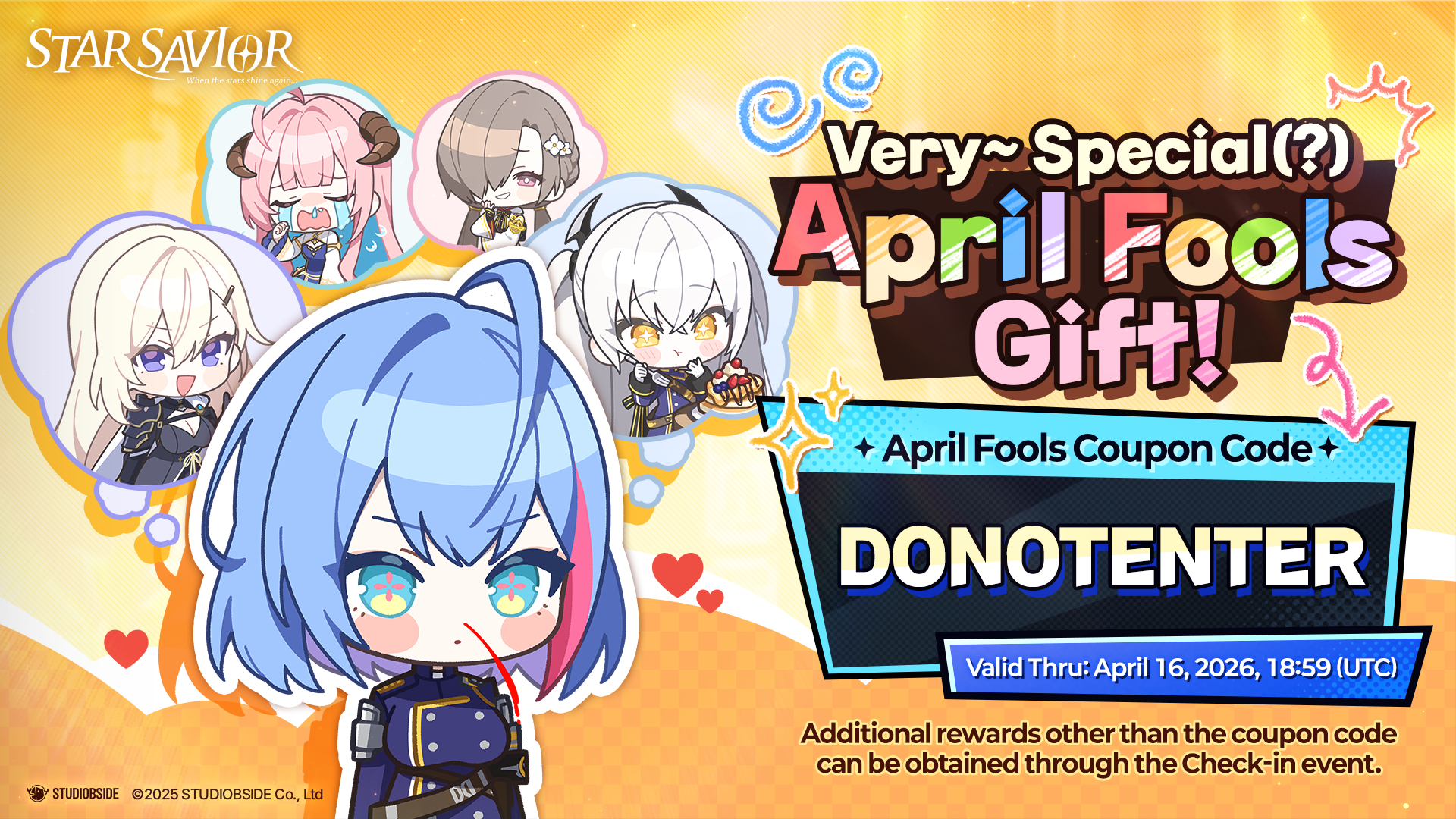 Guide your Star-kissed Saviors, StarSavior!Greetings, Captain! This is your Liaison Officer, GM Lisa.Captain! Do you know what day it is today?We have prepared a surprise event where you can receive a special gift just for you!Even though it is April Fools’ Day, our sincerity toward you is no joke~!Please check the event details below!Event 1. A Special(?) Arcana Appears to Aid Your Journey!A special(?) Arcana just for you will arrive at 19:00 (UTC) on March 31, 2026.Be sure to check the following path at the scheduled time!Game Login > Bottom of Lobby \[HOT&NEW] > \[April Fools’ Check-In Event]※ Please note that the Arcana’s Breakthrough Mission will be available after the April 2 update.Event 2. Do NOT Enter This! Seriously!I… I warned you!? No matter what you do, DO NOT enter this CODE!!??✨ Coupon Code DONOTENTER✨ Available ScheduleUntil 19:00 (UTC) on April 16, 2026✨ How to RedeemAfter logging into the game, go to \[Menu] → \[Settings] → \[Account Management] → \[Enter Coupon] Then enter the coupon code and press \[Confirm].✨ NotesEach account can use the coupon only once during the event period.Rewards will be sent to your in-game mailbox.Mailbox items will be stored for 14 days from the date of receipt. Please make sure to claim them within the period.Thank you.