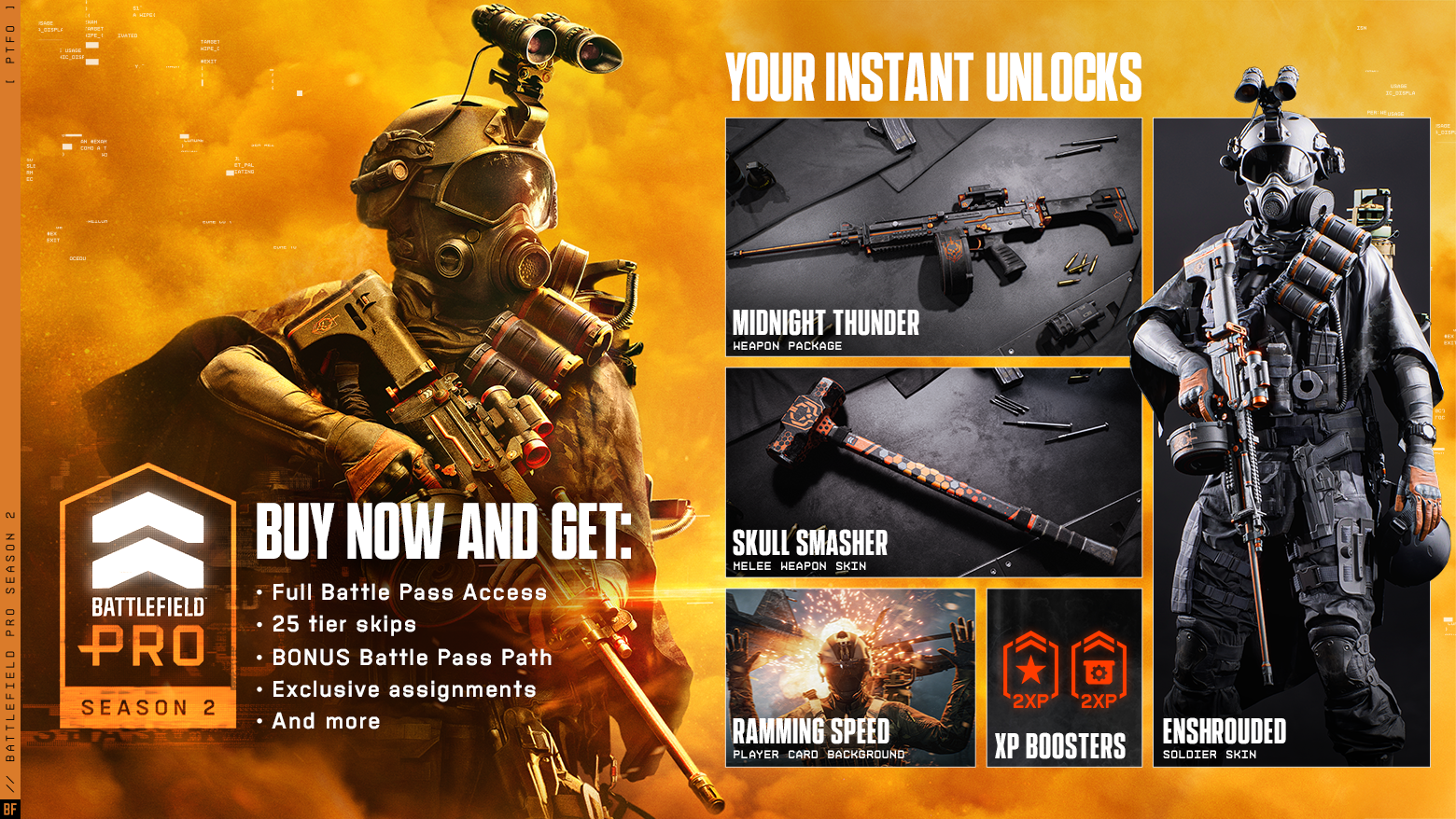 Get ahead of the fight with Battlefield Pro. Gain 6 instant BF Pro unlocks, 25 tier skips, and dig into an exclusive bonus path loaded with tactical gear built to amplify your arsenal and give you the edge on the frontline. Lock in and go all-out.
