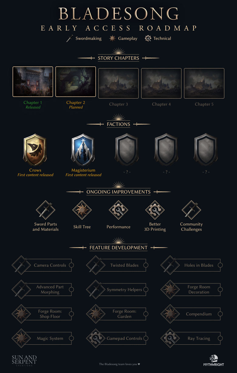 The time is here: Bladesong Early Access is released! We couldn’t be more excited to finally share our swordmaking game with you, and cannot wait to see the masterpieces you will create!Claim your forge and step through the gates of Eren Keep today with a 10% launch discount! If you want to support us developers even more, grab the bundle with the Original Soundtrack or gift Bladesong to a sword-loving friend!https://store.steampowered.com/app/2305640/Bladesong/Bladesong features two gameplay modes:In Story Mode, play the prologue and the first chapter of a five-part story, introducing you to the city of Eren Keep and its mysteries. Craft swords for a wide range of customers, recruit three companions, and encounter two factions: the murderous Crows and the scholars of the Magisterium.In Creative Mode, the forge is yours alone. Push Bladesong’s boundaries using the full range of blade-shaping abilities, sword parts, materials, and creative techniques. Share your swords with the community – or bring them into the real world using a 3D printer.FeedbackWe’re paying close attention to your feedback, bug reports, and ideas. Here’s where to reach us:Discord: Join an amazingly helpful and creative community and talk directly with the developers!Steam Community: Perfect for questions, bug reports, and sharing your thoughts.Steam Reviews: Let us and other players know how your Bladesong adventure is going!RoadmapEarly Access is just the beginning. Here’s a sneak peek at what we have planned for the future:A Word of ThanksFrom the bottom of our hearts, thank you to everyone who has been with us along the way! All your feedback helped us bring Bladesong further than we ever imagined. With Early Access now live, a new chapter begins and we are so ready for it. Let’s make swords!– David and the Bladesong team ⚔️