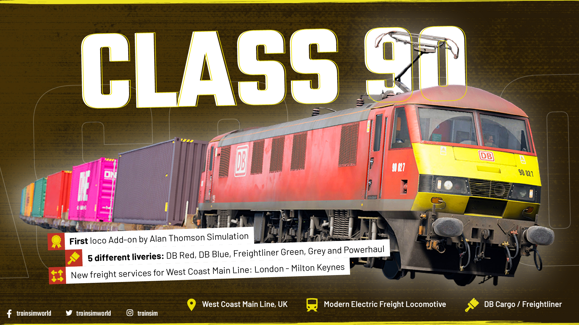 A new UK freight locomotive has arrived to Train Sim World in the form of the BR Class 90 Freight Loco, developed by Alan Thomson Simulation, and releasing today on Monday March 30th!https://store.steampowered.com/app/4035840/Train_Sim_World_6_BR_Class_90_Electric_Freight_Loco_AddOn/Train Sim World® 6: BR Class 90 Loco Add-On will be available for £12.99/€15.99/$16.99The BR Class 90 LocomotiveDerived from advancing British Rail AC technology, and originally being described as the Class 87/2, the Class 90 was designed to get the UK’s electric rolling stock roster up to speed, as widespread electrification had outpaced locomotive construction. The 87/2 scheme was seen as a way of quickly procuring an additional fleet of modernised locos based on a successful frame but was reclassified when the design changed significantly. The resulting fleet of 50 locos being one of the most iconic electric designs built during the BR era.This mixed-traffic loco has been a staple of the UK rail network for over 30 years and whether hauling passenger trains at 110 mph or container freight at 75 mph, the Class 90 is equally at home. Powered by thyristor control, it was a modernised successor to the Class 87, offering improved solid-state traction and reliability.Drivers often praise the Class 90 for its comfortable, ergonomic cabs and helpful driver aids like Speed Set, which maintains a set speed and reduces workload—especially on long runs.This Add-on will highlight its freight capabilities, ensuring you can run to time up and down the West Coast Main Line without interfering with higher-priority traffic.Livery VariantsThe Class 90 loco Add-on includes the following variants:DB Cargo (red)DB Cargo (blue)Freightliner (grey)Freightliner (old / green)Freightliner (new / Powerhaul)These all come with their own minor differences in details, including the relevant locomotive numbers for each livery.“Livery creation has been handled by IMBUE, who’ve delivered a diverse and high-quality set of liveries that complement the pack’s flexible service mode. Players will be able to choose the freight run that suits them best, adding replay-ability and variety."Systems and Interactive FeaturesThe cab of the Class 90 will have elements familiar to players of other trains in Train Sim World. The throttle and brake handles are similar in design to that found in the HST, as are some of the dials, yet accompanying these are traction motor gauges like those found in the Class 87 and 86 locomotives.Being a freight locomotive, some switches to the left of the driver’s seat and the interactive operator interface for train length are like those seen in the Class 66. Players may also notice what look like shunting controls in cab by the door. In reality, these have been isolated out of use for many years and cannot be interacted with.UK Safety Systems are fully modelled, including TPWS, AWS and DSD, as well as the new working Speed Set feature, and interactable GSMR radio. As the machine room is not modelled, the DSD isolation is activated by interacting with a noise level warning sticker on the machine room door to represent a driver entering the room to enable / disable it. The Class 90 also includes a fully operational BIS and realistic Neutral Section functionality.Multiple Working capabilities have also been implemented, allowing for heavy-haul operations with other Class 90 locomotives.Train Faults are also present for players with the relevant Settings Enabled as part of the new Train Sim World 6 Core feature. These consist of wiper and pantograph failures.The Route:West Coast Main Line: London – Milton KeynesGameplay for the Class 90 will be focussed on the first stretch of WCML introduced to Train Sim World between London Euston and Milton Keynes.This arterial route connecting some of Britain’s major cities to London has seen plenty of action from its initial opening through to today’s services, with numerous amendments and redevelopments of stations along the way, as well as the ever-changing rolling stock that use it.Services in a dedicated weekday timetable will originate at Wembley Yard, Willesden or Camden Junction hauling intermodal shipping containers north out of London, or from Milton Keynes bringing trains back into the city.3 Scenarios are also included for the route, as is a 20 minute Tutorial in Training Center.Players will undoubtedly wish to utilise Free Roam to take the Class 90 elsewhere on the UK network, such as the East Coast Main Line, or on other stretches of the WCML like Just Trains’ Preston – Carlisle route Add-on or Birmingham – Crewe, by All Aboard Studios.Formation Designer and Livery Designer can also be utilised to create alternative freight consists, including use with Class 66 locomotives or passenger railtours.Train Sim World® 6: BR Class 90 Loco Add-On will be available from 30th March for £12.99/€15.99/$16.99Watch our Showcase for the BR Class 90!Join Executive Producer Matt, Community Manager Harry and gues