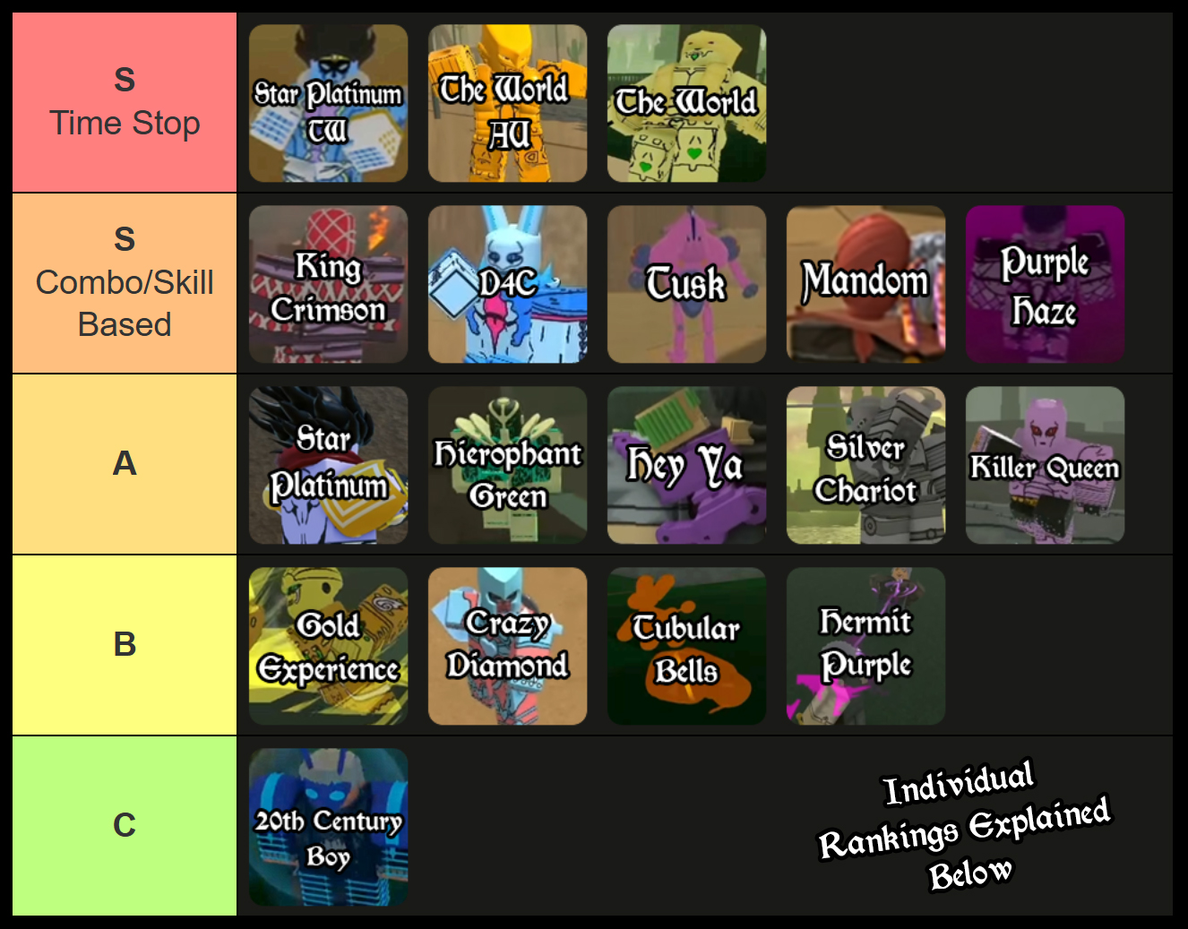 - B-Tier Stands: These are situationally powerful stands that have more weaknesses than the higher tiers.