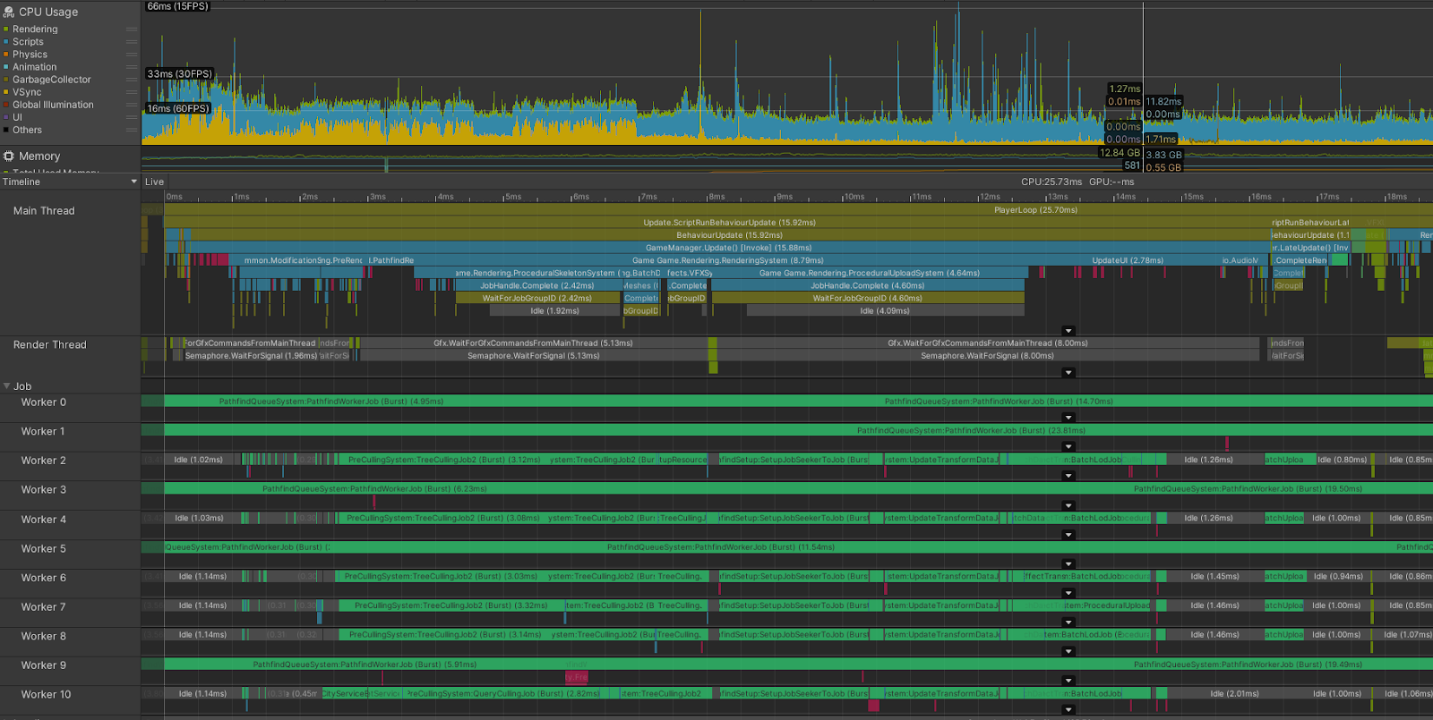 Unity Profiler is used to track the Pathfinding performance bottlenecks. In this case, many of the CPU threads are busy with pathfinding and related calculations.