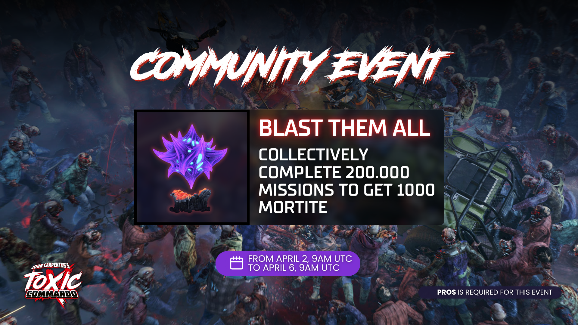 Hey Commandos,This week-end, we're having our first Community Event on John Carpenter's Toxic Commando. Here's what's happening and how to get your rewards: ➡️ Collectively complete a grand total of 200 000 missions to unlock a 1000 mortite reward➡️ This event will be live from 03/04 9 AM UTC to 06/04 9 AM UTCHow to enter and claim your rewards ?To claim your rewards, you must create a PROS account and link John Carpenter's Toxic Commando to the platform you're playing on. This can be done easily by launching the game and scanning the QR Code in the main menu.The rewards will be credited (should the objective be reached) on the account you linked to PROS.We're counting on you Commandos, don't waste any time and start slaying zombies now!