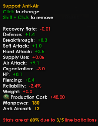 Right now, equipment and stats also scale with the size of the regiment. So if you have less battalions inside a regiment, the associated support company will also be smaller. This is to have a check on power and prevent making small divisions overly strong, at the moment.