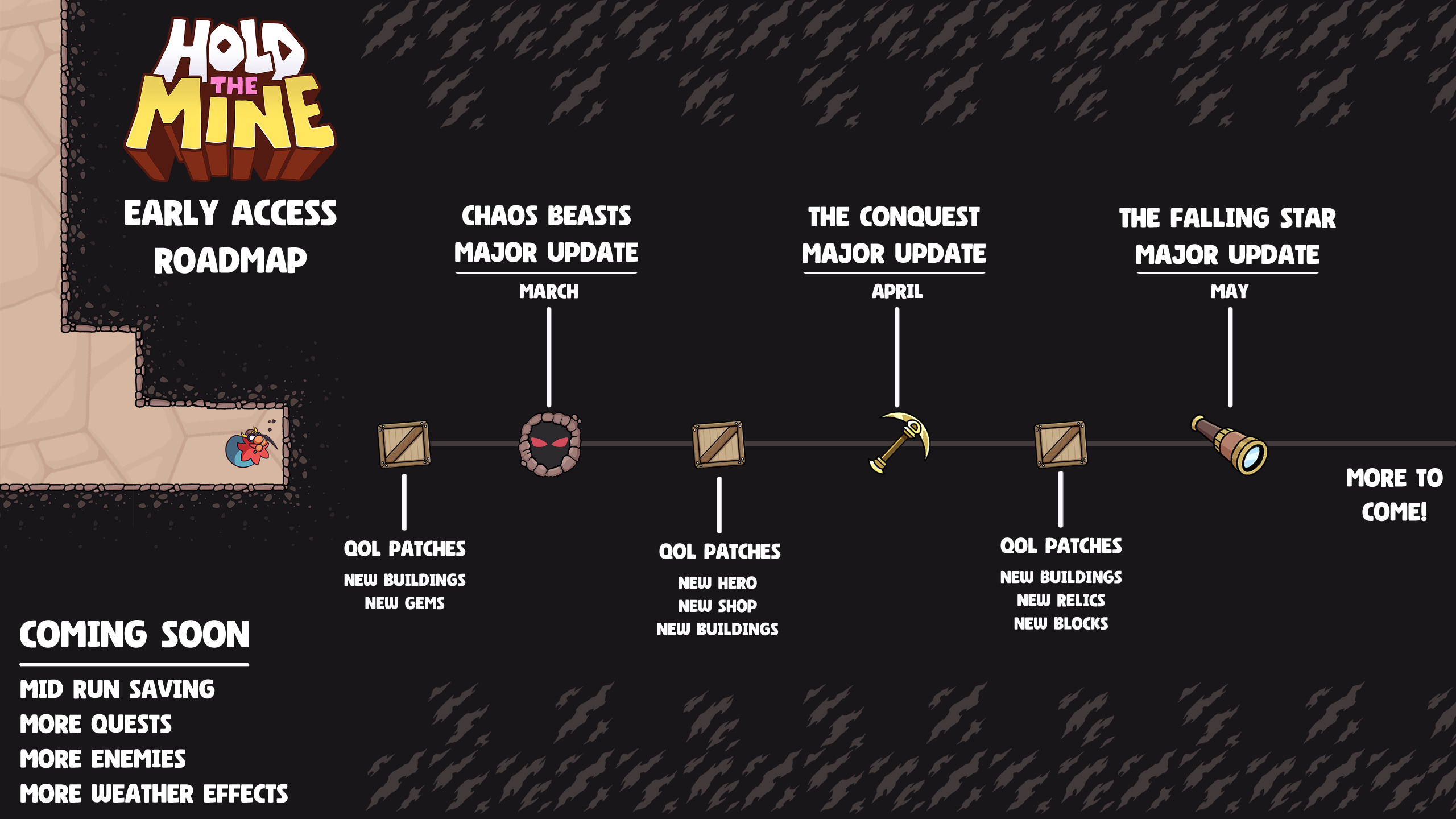 Hello miners!Thank you for sharing your feedback! Today I can finally share the Early Access Roadmap for the upcoming months! I've been reading through all your Steam reviews, and I appreciate the feedback we've been receiving. Keep in mind this is just the beginning of Early Access. If you like the game, it will be really helpful to leave a review!Early Access Roadmap #1Here is the first Early Access Roadmap for the upcoming months! I'll go into each major update details below.Keep in mind those major update are not all the things I'll add to the game, more content are coming along the ways. Below, I will just focus on the main features included.Major Update #1 - Chaos BeastsThe first major update will add Bosses, a brand new feature that makes every run feels more unique! Bosses will impact both gameplay phase of the game: the mining and the battle with spicy effects. Each boss has its own set of effects you'll have to deal with to win a run. And things will be even be crazier once your reach the Endless. Major Update #2 - The ConquestThe Conquest Mode is a brand new mode full of challenges to explore new mechanics in the game and create unique scenario with important gameplay twists. It will also include a custom mode to customize the content available during the run and increase different difficulty settings. Major Update #3 - The Falling StarThis update will include a brand new set of synergies, a new hero and more buildings, relics and gems centered around those! More content is coming in the next few days, weeks and months. I have no intention to leave people disappointed or to abandon this game. Regarding some feedback and most urgent concerns raised:- Is mid run saving planned?Yes, definitely! Work has started already before the release, but the system is not fully done (especially saving your progression in the mine is currently not working). I cannot provide any ETA for now, but I’ll make sure to give you update on the matter as soon as possible.- Is controller support planned?Yes! This is something I want badly, but I’m not sure when I’ll have more time to work on this, as new content and mid run save are definitely bigger issues for now. It’s definitely something I want to implement before the full 1.0. - Meta progression?I know it’s a big topic and people rightfully raised concerns about the lack of it. Be sure I’m thinking about the best way to implement it, either for global progression and/or for a brand new game mode. - What about the lack of content?First, keep in mind this is the beginning of Early Access. I’m aware people feel like the game is short in that regard, especially because of how the content is split (or not split) between one run and another. Hold The Mine doesn't offer a different load out or a limited by an amount of weapons/skills per run. You have access to everything, for better or worse, and it means every run can end with a very similar set of heroes, buildings and relics. More content is coming in the next few days, weeks and months. I have no intention to leave people disappointed or to abandon this game. Of course, I’d love to hear your thoughts and suggestions and learn what you want to see in the game the most.Again, thank you so much for all the support! paci----Join the Hold The Mine Community Come be part of the Hold The Mine community. Join us on Discord (link) to share your thoughts, talk with other players, share your tips and see what others are building underground. You can also find updates and discussions on Reddit (link). ----