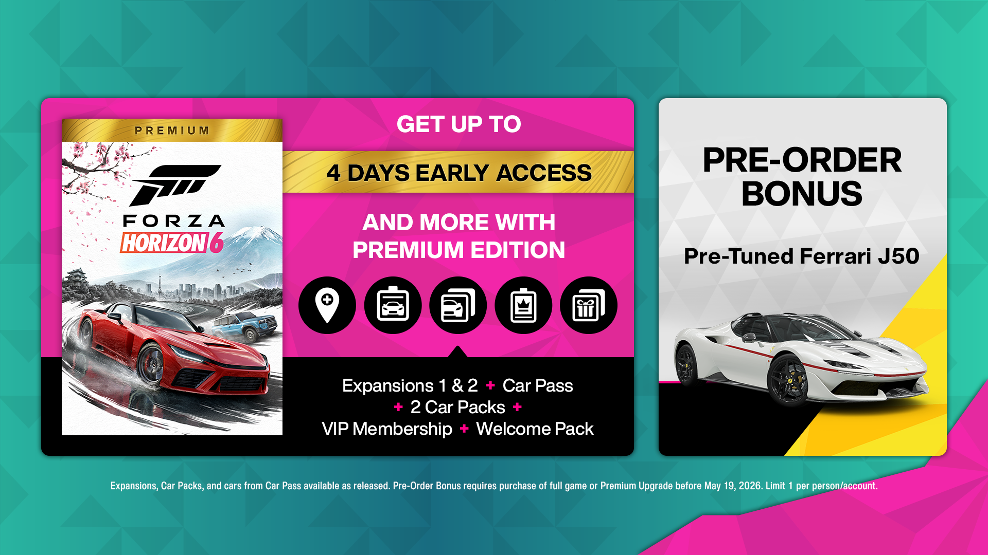 Forza Horizon 6 is coming to Xbox Series X|S consoles and PC on May 19 and to PlayStation 5 later this year, with Early Access included in the Premium Edition. Game Pass Ultimate and PC Game Pass members can also purchase the Premium Upgrade to play the full game up to four days early starting on May 15.