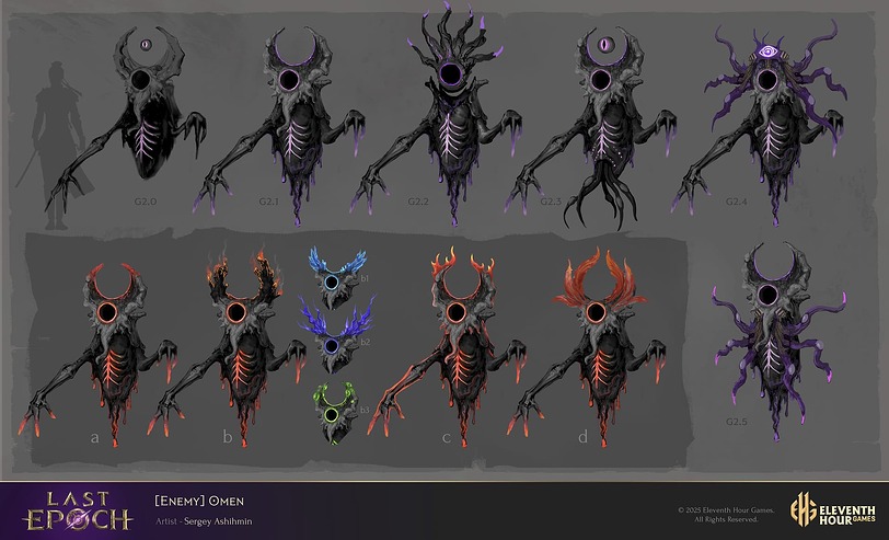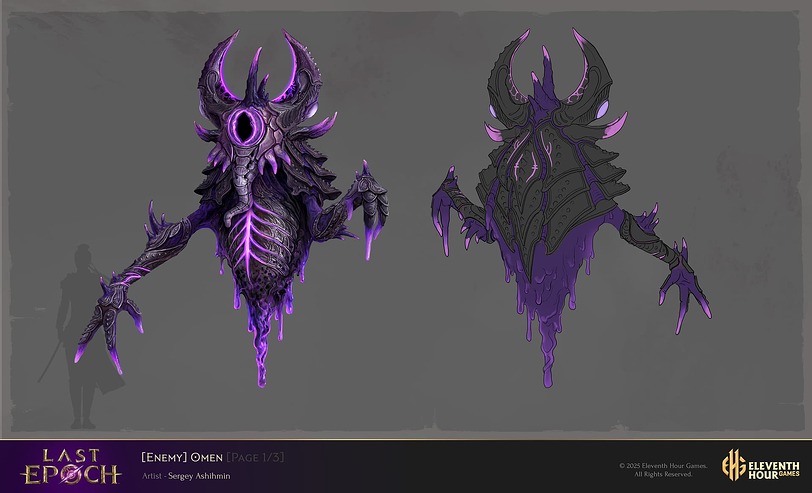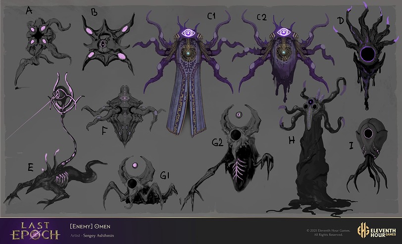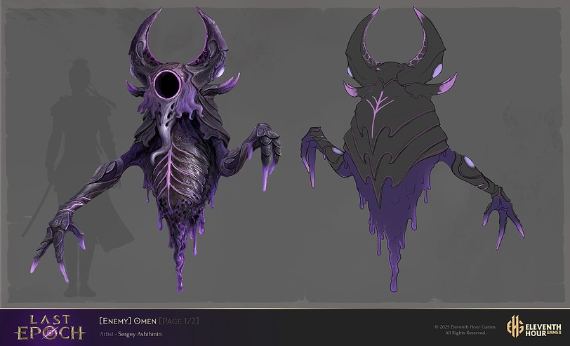 Hello Travelers!March has come and gone. With it, the long-awaited launch of Season 4: Shattered Omens happened. What was once just beyond the horizon is now here, inviting you to dive into a darker, more unpredictable Eterra. From shattering Omen Windows to experimenting with the risks and rewards of Item Corruption, Season 4 introduces new systems that reshape how you approach combat, loot, and progression.We’ve loved watching the community jump in, theorycraft new builds, and push the limits of what’s possible with these new features in Season 4. Whether you’re chasing corrupted gear or braving the new Vision of the Observer, there are no shortage of ways to test your strength this season.In this month’s Eterra Monthly, we’ll be taking a look at the Omen’s design from start to finish, highlighting some UI updates based on feedback, early content creator builds, a little void surprise, and more so let’s dive in.Development Highlight: The Omen Start to FinishOur Art Director, Dmitrii Kuznetsov, and Lead Writer, Kyle Melberg, took some time to share the story behind the Omen released in Season 4.Kyle: The LoreFor Season 4 we wanted to introduce a singular new enemy with a theme of corruption and could fit a mechanic themed around empowering surrounding enemies. Since we had just come off the heels of introducing Chapter 10 in Season 3, we wanted to dive deeper into some of the elements seen at the end of the chapter, namely the windows seen in the final encounter.For the Omens we wanted a bit looser of a guideline and more exploration. Here we gave the rough theme and inspiration of the Omens and a few examples of how different damage types could be expressed:Omens are beings of pure void that take their form from moments of intense despair, the same moments that drove the Observer mad and caused him to transform into Orobyss.When an Omen appears, it fills the surrounding area with the despair that fueled the Observer's madness, influencing and empowering the enemies nearby and summoning void creatures as the world corrupts around them.The Omens are inspired by various specific tragedies that the Observer foresaw, resulting in variants that are themed after separate damage types.With this, we released the Omen with four different variants: Fire, Cold, Lightning, and Void.Dmitrii: The ArtPart One: ConceptWe set out to explore silhouettes and identify the key visual features of the Omen. One of our primary goals was to establish a connection to The Observer, while making it clear that this entity is not him, but rather his herald.At the same time, we were developing the game design, so certain details evolved throughout the process. For example, early information suggested these creatures would be relatively small, making it important to avoid overly complex designs and instead keep the silhouette and details clear and readable.We ultimately landed on the G2 version, though I provided feedback to increase the thickness of the arms to improve readability at our typical camera distance.Part Two: Concept RefinementWe continued exploring additional ideas within the selected direction, including elemental-themed variations. For the base version, we chose to retain the current horn design without over complicating it. From there, we developed several compelling options for Fire, Cold, Lightning, and Poison variants. (We ultimately didn’t release a Poison version and replaced it with Void.)Part Three: The RenderOnce the features and details were locked in, we moved into finalizing the render. This phase is typically straightforward from a design perspective, though it can be quite time-consuming. Ideally, we avoid making further design changes at this point since the direction is already established, but this time was an exception.As we continued refining the mechanic and building out the prototype, we realized the creature couldn’t remain as small as originally planned (there’s a human scale reference in the image). Given how intense and chaotic the encounter could be, the creature needed to read clearly in combat and feel more threatening, something that was difficult to achieve at the initial size.We decided to scale the creature up, but simply increasing its size wasn’t enough with the existing level of detail. To support the change and avoid it feeling like an oversized, underdeveloped form, we introduced additional details to better convey its presence, scale, and danger.Part Four: Additional Details and SizingTo support the increased size, we introduced additional details and adjusted key shapes. Compared to the previous version, you can see added elements throughout, along with a slight change to the eye shape, which previously gave the creature an unintended “baby-like” appearance.Part Five: The Final ModelDuring the modeling stage, we revisited the design and decided to remove the elongated nose. While it initially felt like a unique feature, we ultimately agreed it risked looking unintentionally silly rat