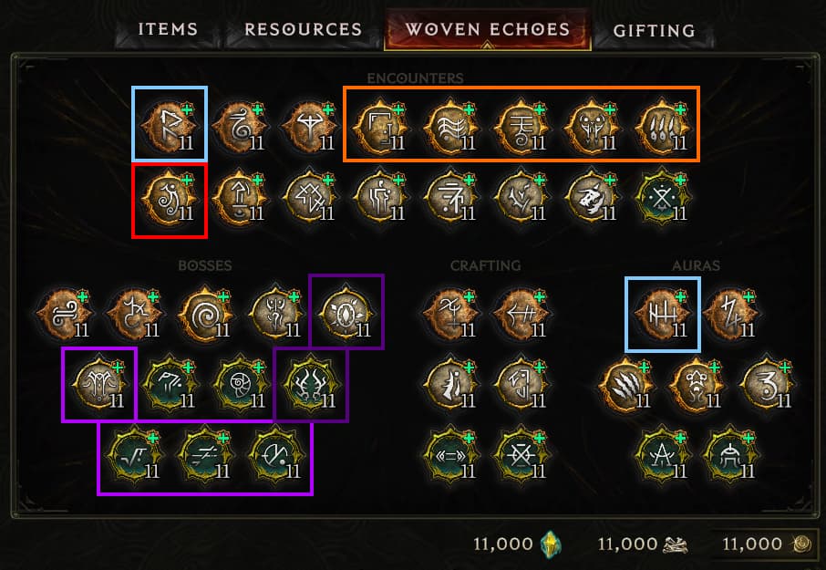 Woven Echoes that affect other nearby echoes (those that display a range indicator when placed) are now grouped in the Auras section.