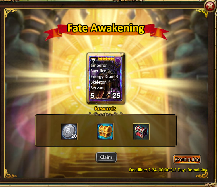 Consume 90,000 gold coins: Black Opal*1, Godlike Box II*6, Solar Chest (Legendary)*6, Silver*5,000,000