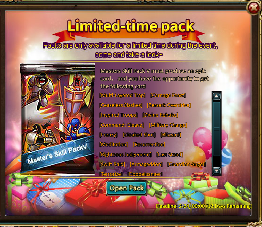 Consume 50,000 gold coins: Black Opal*1, Solar Chest (Legendary)*4, Pet Pleasure*5