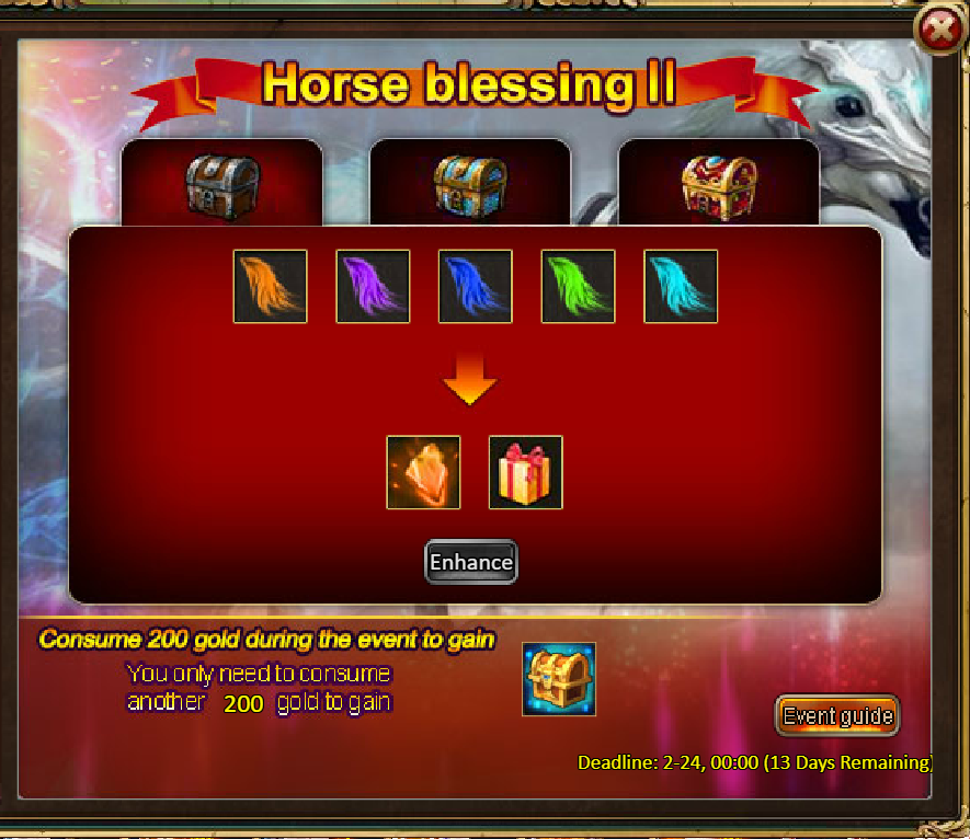 Consume 2,000 gold coins: Lunar Chest (Epic)*1, Fodder (Legendary)*10, Pet Snack*1