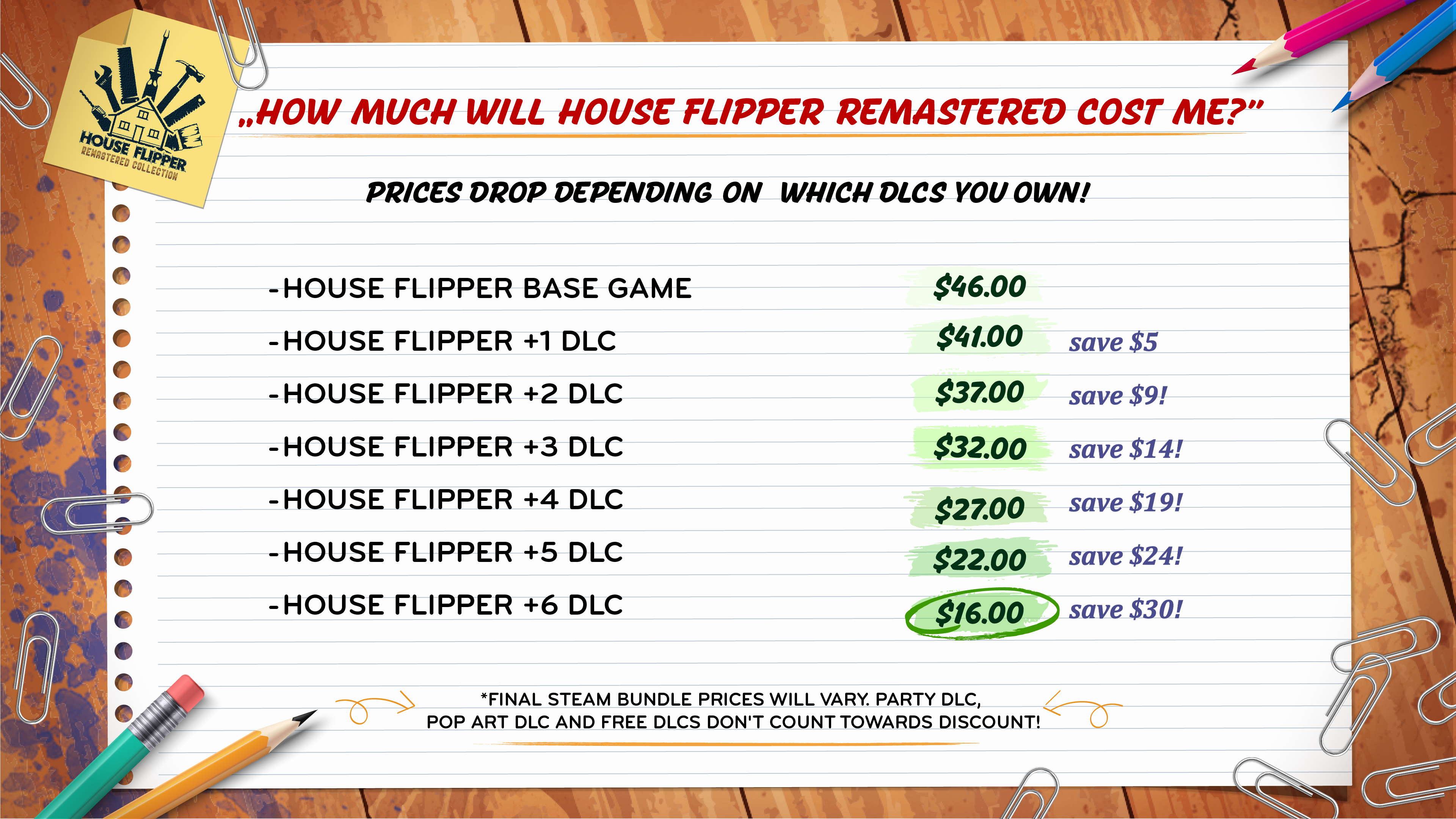 ⌛ Nearly 8 years after release......8 DLC launches, and countless updates and patches, the original House Flipper can finally find its cozy place in your (or your friends'!) Steam library - free to keep on Steam from 3–6 April.Over all this time, more than 10 million players started their flipping adventures on both PC and consoles. While the developers were working tirelessly on all the new updates, patches, and DLC content, the community of fixer-upper lovers has grown a lot.This growth led to many outstanding achievements, such as over 50,000 Steam Workshop items created by players, as well as numerous amazing ideas and suggestions the devs used to enrich the flipping experience together!https://store.steampowered.com/app/613100/House_Flipper/This is a fantastic opportunity to play the one and true House Flipper in its original form and see firsthand why the game is so popular. Once you start, you just can’t stop flippin’!????️ House Flipper Remastered Collection: Pricing Details & Playtest!Today, we're ready to share all the details. We want to be completely transparent with you, especially regarding how we plan to reward our veteran players who already own the original game and its expansions. Let's dive in!The base price for House Flipper Remastered Collection is 49.99 USD.Please keep in mind that in Remastered Collection, you get the significantly improved versions of House Flipper 1 and all of its DLCs. This means the price covers everything from the original game experience, plus brand-new bonus content including new jobs, hundreds of new items, and more! For comparison, purchasing the original game with all its additional content at full price would cost around 120 USD.We also want to reward our loyal community. Depending on how many “big” DLCs (Garden, HGTV, Luxury, Pets, Farm, Dine Out) from the original game you already have in your Steam library, your price will automatically drop:base game only - 46 USDbase game + 1 DLC - 41 USDbase game + 2 DLC - 37 USDbase game + 3 DLC - 32 USDbase game + 4 DLC - 27 USDbase game + 5 DLC - 22 USDbase game + 6 DLC - 16 USD???? Remastered Collection Playtests are still LIVE! What can you test?You can still check House Flipper Remastered Collection for a few more days during the Steam House and Home Fest 2026! For this playtest, we've prepared 2 jobs and a house for you to buy and renovate.Playtests End: April 6 @ 10:00 AM PDT / 5:00 PM GMT / 7:00 PM CESTYou can join the playtests via Steam and try the game out until April 6th:https://store.steampowered.com/app/3710840/House_Flipper_Remastered_Collection/ https://docs.google.com/forms/d/e/1FAIpQLSet2OUK6NaQ0PY7P55wJXXUIkyDOSTWl0PH4IhyFMsQeZML6A/viewformAlongside the playtests, we have launched our official feedback survey. Be sure to check it out and let us know what you loved and what you'd like to see improved in the Remastered Collection.We are monitoring all the feedback and comments, and we've already fixed a few issues you found! After the survey is closed, we will carefully analyze every comment and pinpoint the things that still need some work.We will keep the survey open a few days longer than the playtests themselves, giving you plenty of time to share your thoughts.Have a lovely weekend Flippers! ❤️