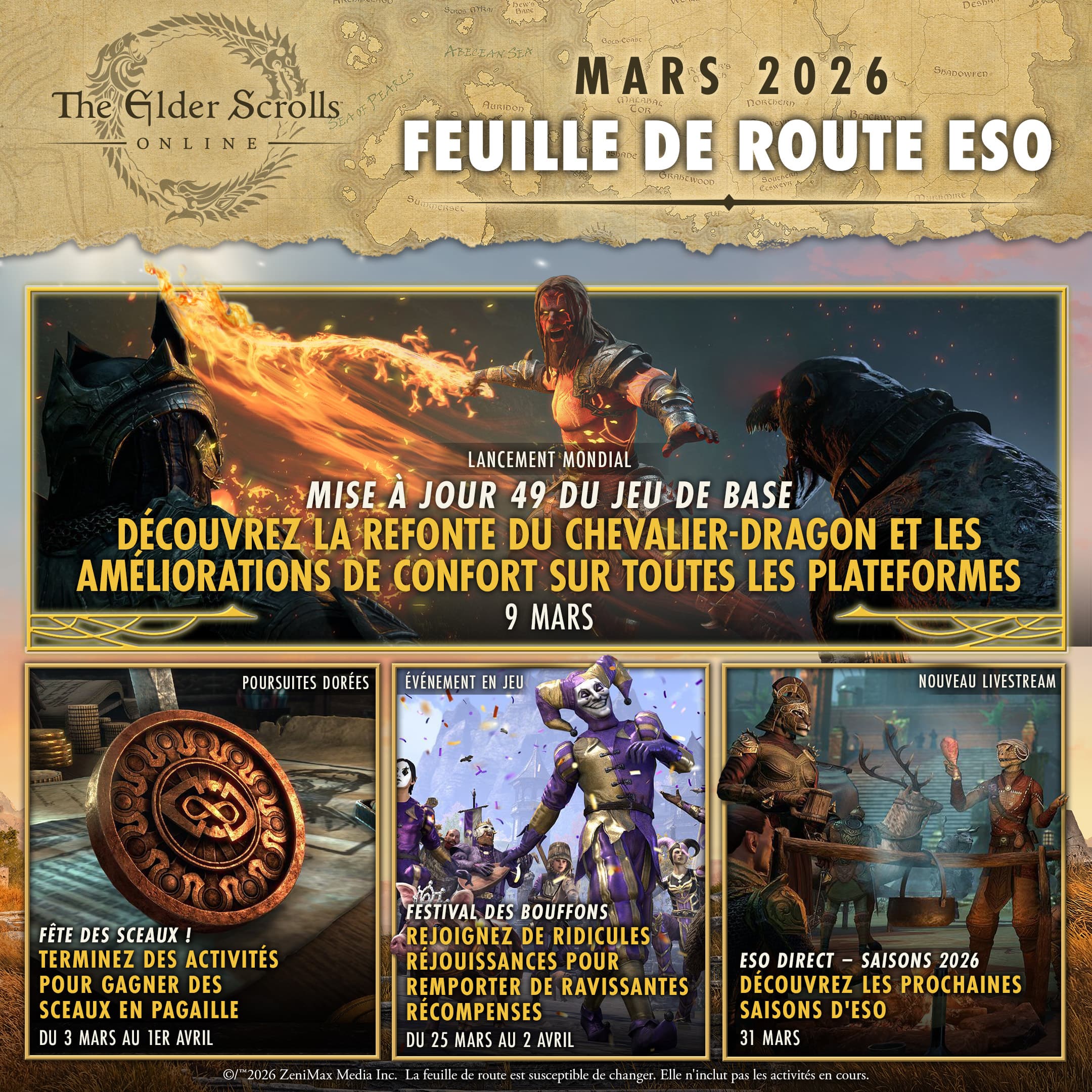 En mars, préparez-vous à découvrir la mise à jour 49, une nouvelle campagne des poursuites dorées, des événements et bien plus encore. Week-end de match à mort à deux camps (du 25 février au 4 mars)Gagnez 25% de PA supplémentaires en croisant le fer lors du mini-événement de PvP du week-end de match à mort des Champs de bataille ! Fin des Volontés et des récompenses de connexion quotidienne (1er et 2 mars)Afin de préparer l'arrivée des saisons et des Tomes de Tamriel le 2 avril, les récompenses de connexion quotidienne seront désactivées le 1er mars, et les Volontés le 2. Et ne vous en faites pas,[/url] car, dès le 3, vous pourrez faire le plein de Sceaux avec la nouvelle campagne des poursuites dorées ! Vous pouvez gagner jusqu'à 2 500 Sceaux de Volontés !Poursuites dorées – Fêtes des Sceaux (du 3 mars au 1er avril)Comme nous venons de le dire, vous pouvez gagner jusqu'à 2 500 Sceaux de Volontés en terminant toutes sortes d'activités en Tamriel pendant la campagne des poursuites dorées de mars ! Gold Road dans les jeux mensuels PlayStation Plus (du 3 mars au 6 avril)Avec votre abonnement PlayStation Plus, vous pouvez obtenir gratuitement la Collection Gold Road et la conserver à vie. Cette offre à durée limitée s'inscrit dans le cadre du programme de jeux mensuels de PlayStation Plus, ne passez surtout pas à côté. Mini-événement : +100% d'EXP dans les lignes de compétences (du 9 au 25 mars)Gagnez 100% d'EXP supplémentaire dans vos lignes de compétences au fil de vos aventures en Tamriel. C'est le moment de débloquer toutes les évolutions ! Lancement de la mise à jour 49 (9 mars)Découvrez la refonte de la classe du Chevalier-dragon, une multitude d'améliorations de confort et bien plus encore avec la mise à jour 49 du jeu de base ! Elle sera disponible en même temps sur toutes les plateformes, et posera les bases de la Saison Zéro, dont le coup d'envoi est prévu pour le 2 avril. Lors de votre première connexion après la mise à jour, vos tickets d'événement seront convertis en lingots de commerce, que vous pourrez dépenser au Bazar de la Côte d'or une fois que celui-ci aura ouvert ses portes. C'est la période de l'année où il ne faut pas avoir peur du ridicule !Festival des bouffons (du 25 mars au 2 avril) Du 25 mars au 2 avril, semez la terreur dans la joie et la bonne humeur pour recevoir des récompenses désopilantes, dont le style de tenue « Un Mauvais Chevalier » et des meubles sur le thème du Festival des bouffons. Inauguration du Bazar de la Côte d'or (25 mars) Le Bazar de la Côte d'or est une nouvelle boutique où vous pouvez acheter des objets de collection classiques avec vos lingots de commerce. Il ouvrira ses portes un peu avant le coup d'envoi de la Saison Zéro, qui aura lieu le 2 avril ! Livestream sur l'amélioration de l'expérience (26 mars) L'équipe Community d'ESO et Kira Schlitt, Feature Lead, vous donnent rendez-vous sur http://twitch.tv/Bethesda le 26 mars 2026 à 19 h pour découvrir quelques-unes des améliorations qui vont faire leur apparition dans le jeu. Livestream : ESO Direct – Saisons 2026 (31 mars) Offrez-vous un avant-goût de la Saison Zéro et des suivantes avec un livestream spécial présenté par l'équipe de développement d'ESO. À ne manquer sous aucun prétexte ! Entre le lancement de la mise à jour 49, les événements, les livestreams et tout le reste, vous n'allez certainement pas vous ennuyer dans ESO en mars ! Il y a d'autres choses qui vous attendent, alors gardez un œil sur notre site officiel pour ne manquer aucune annonce. Qu'attendez-vous avec le plus d'impatience ? Dites-le-nous sur Bluesky, X (anciennement Twitter), Instagram et Facebook.