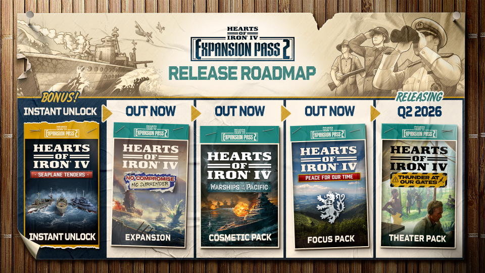 Generals!It’s time for your latest briefing. Make sure you read it, and comment below.Makeship Giveaway ResultsLast week we announced the HOI and Makeship Giveaway (Plushie and Socks) and you gave us some very fun and interesting responses. We read through all of them and without further ado the winners are:Imladris78, you get a plushie!Pingu power, you get a plushie!Mayor Faizan, you get a pair of Naval Feet socks!And, select_L0L, you also get a pair of Naval Feet socks!Should we make achievements easier?Ideally we’d love for you to use the form, but if you can’t access it or prefer to answer in this thread that works too.They’re four simple questions:Question 1 How many hours do you have in HOI IV?Question 2 - Should Iron Man be required for achievements? a) Yes, Iron Man SHOULD be required for achievementsb) No, Iron Man should NOT be required for achievementsc) Something else, I'll leave a commentd) I have no opinionQuestion 3 - Should you be able to enable MODs for achievements?a) Yes, you SHOULD be able to enable MODs and get achievementsb) No, you should NOT be able to enable MODs and get achievementsc) Something else, I'll leave a commentd) I have no opinionQuestion 4 - Approximately how many HOI IV achievements do you already have?a) Fewer than 10b) 11 to 49c) 50 to 99d) 100 or moreRecent Live Streams - Peace for our TimeWe just released Peace for our Time and hosted two live streams. Watch them here (again):Peace for our Time - Developer Live StreamPeace for our Time - Release Live StreamMerchSome people love it, some people … less. If you’re in the latter group that’s fair enough, feel free to skip to the Next Section.For everyone in Group 1, look over here!The Next SectionExpansion Pass 2 - Get it now and be ready for Thunder at our Gates!