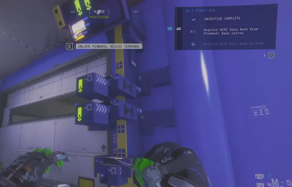 Image via Bungie Take the elevator, run straight through two doors, and a quest marker will appear. You'll be approximately at the center of the Pinwheel Base location. Next, return to the same spot where you found the terminal (where you submit the Clearance Codes), and you'll find a DCON nearby.