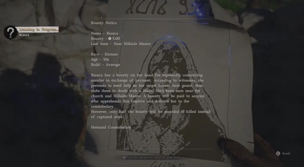 Bianca is the third bounty that you can complete in Crimson Desert, and you'll need to capture her from her hideout to get all the available rewards. To do so, you'll first need to accept her bounty, which provides you with the intel on what needs to be done. While the bounty event itself is relatively simple, this guide will make your life easier if you've lost your way in Pywel.Table of contentsHow to start the Bianca Bounty quest in Crimson DesertHow to capture Bianca in Crimson DesertHow to start the Bianca Bounty quest in Crimson Desert Image via Pearl Abyss To begin the bounty, you'll need to find the public post that announces what needs to be done. You can find the poster stuck on a lamp just near Beggar's End, located on the outskirts of Hernand. However, the bounty also seems to appear on other notice boards or randomly stuck on walls around Hernand. You'll also need to clear the previous bounties to make Bianca's capture quest appear on the notice boards. Once you read the poster and accept the contract, you can start hunting Bianca.How to capture Bianca in Crimson Desert When you read the poster for Bianca's Bounty, it will state that her last-seen locations were Church of Hernand and Hillside Manor. This is true for all bounties, as the last-seen sightings of the criminals are listed. I have marked the location on the image above for your ease. Screenshot and remix by Destructoid Bianca could be present in either of the two buildings mentioned above. Usually, most players appear to find her in the church, where she's in one of the kitchen buildings. However, she can also be found at the Hillside Manor in one of its rooms. There's apparently a bug that can sometimes prevent Bianca from spawning at the locations. If that happens, sleep and visit the places at a different time, and you should be able to find Bianca. Image via Pearl Abyss Once Bianca spots you, she'll start to run. Chase her down, and you'll get the tackle button prompt when you're close enough. Put her down on the ground, and then punch her until the 'Tie Up' button pops up. Tie her up and grab her to drop her at the nearby constabulary. When you drop Bianca at the nearby constabulary, you'll get several rewards.Five Silver Coins300 Hernandian Contribution EXP If you accidentally (or not) kill Bianca, all your rewards will be halved. Hence, it's in your interest to bring her alive to the constabulary. The post How to complete Bianca Bounty in Crimson Desert and capture her appeared first on Destructoid.
