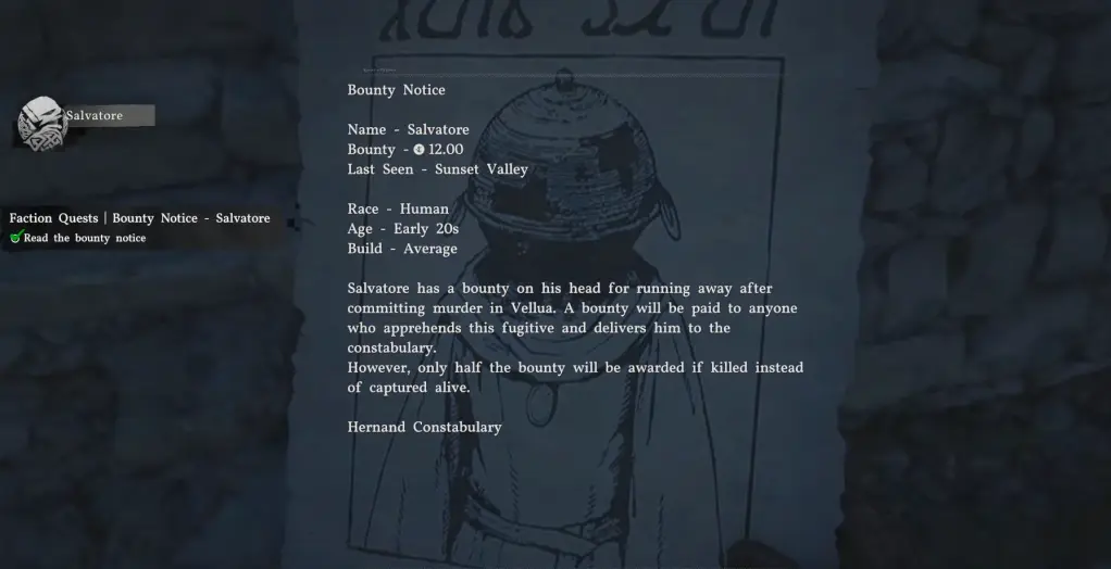 The Salvatore bounty is one of the latter set of contracts in Crimson Desert, and you'll need to capture the outlaw to bring him to justice. However, the job is easier said than done, as you'll need to find him from his hideout. That comes after you accept the poster that states the details of the bounty on offer.