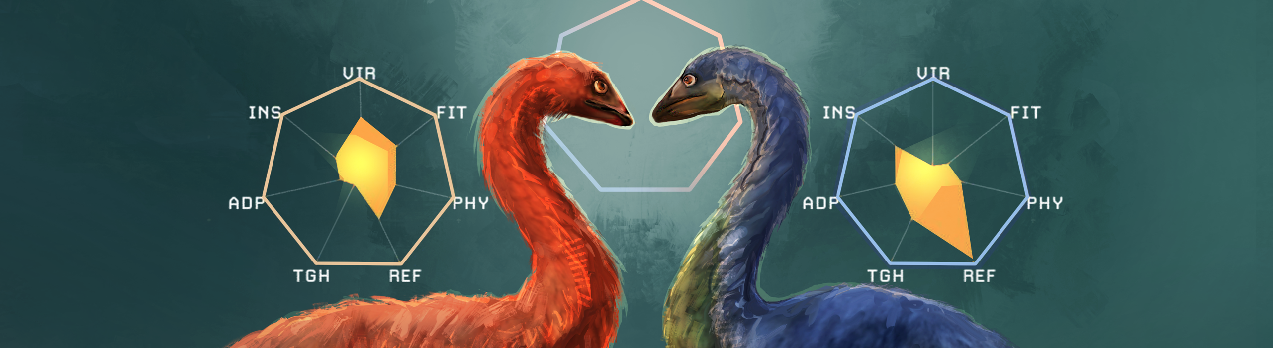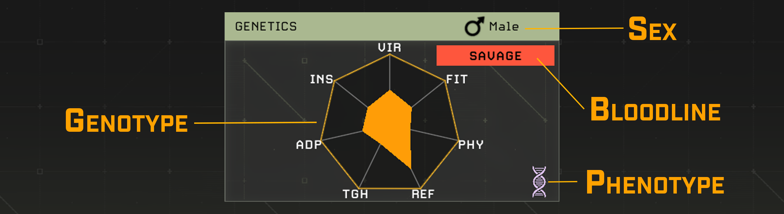 Genotypes are attributes that can enhance or reduce a creature’s base stats, with each attribute influencing multiple core stats. The initial set includes Vigor, Fitness, Physique, Reflex, Toughness, Adaptation, and Instinct. Attribute values range from 1–10, with 3 representing the baseline creature stats. Values below 3 reduce stats, while values above 3 increase them. Wild creatures will generally generate around this baseline with some natural variation.