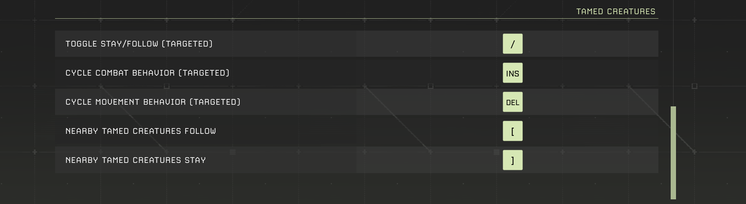 Five new keybinds allow you to remotely control a single tamed creature or all nearby creatures. Supported actions include toggling stay/follow and cycling through combat and movement behaviors.