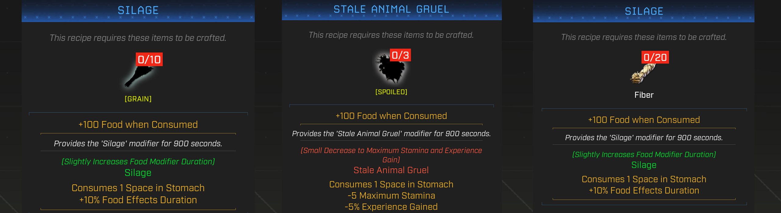 - Adde two new animal feed recipes: Stale Gruel and Silage. Both are craftable on Electronic Food Trough, Silage can also be made on Ranching Station
