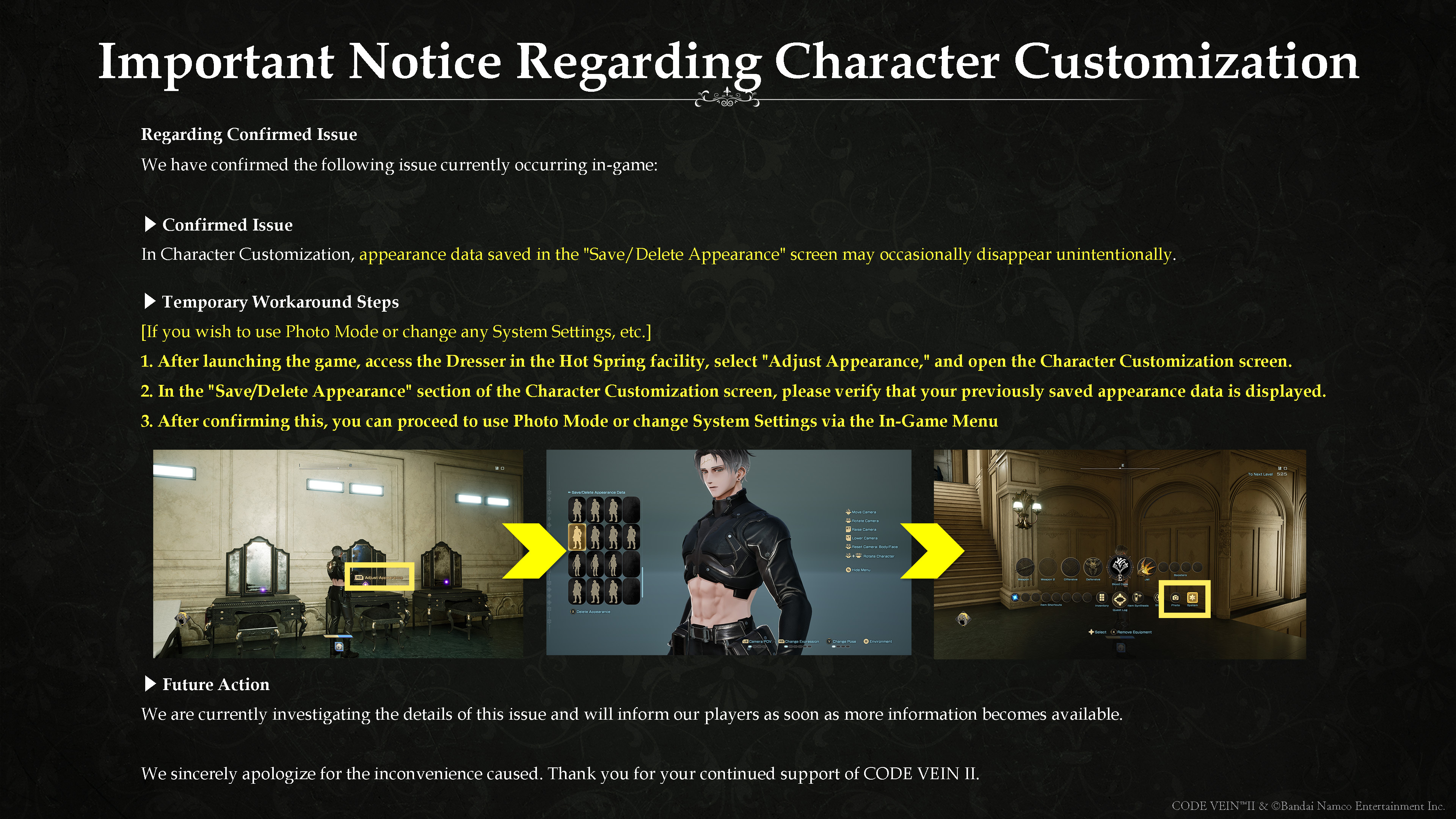 Dear CODE VEIN II Players,We have confirmed an issue in the currently available Character Creator Demo for CODE VEIN II, where data saved in "Save/Delete Appearance" may disappear unintentionally.Please refer to the attached image for details and workaround steps:We are currently investigating the cause and preparing a fix, and will share updates as soon as they are available. We sincerely apologize for any inconvenience caused.