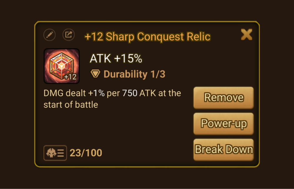 ▶ Relic Durability There is an important point you must know regarding Relic Power-ups. It's the \[Durability] system, which does not exist for Runes or Artifacts. Every Relic starts with a Durability of 3, and each time a Power-up fails, the Durability decreases by 1. Once Durability reaches 0, you can no longer attempt to power up that Relic. Unlike Runes, which can be powered up to +15 with sub properties added or increased randomly, Relics are assigned fixed values upon each successful Power-up within a limited Durability. Therefore, the key is how many successful Power-ups you can achieve before failing three times. If Durability is exhausted, further Power-ups are impossible, but the Relic will not be destroyed and can still be used on Monsters. Relics that cannot be powered up further or don't fit your needs can be broken down for \[Relic Pieces] and \[Relic Power-up Stones]. You will obtain a set amount of \[Relic Pieces] upon breaking down Relics regardless of the Power-up level, which can then be used for Relic Crafting. \[Relic Power-up Stones] are used for powering up Relics and are distributed differentially upon breaking down Relics based on the Power-up level.