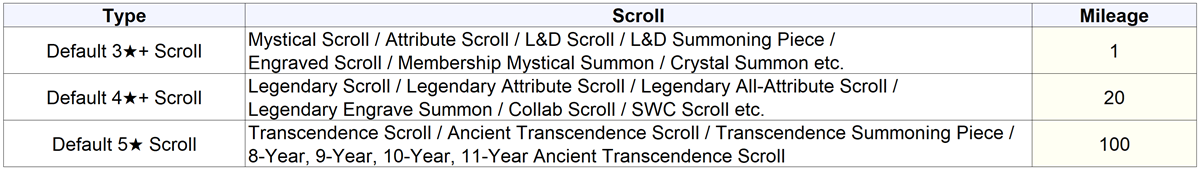 The types of scrolls eligible for mileage and the points earned per scroll are as follows.
