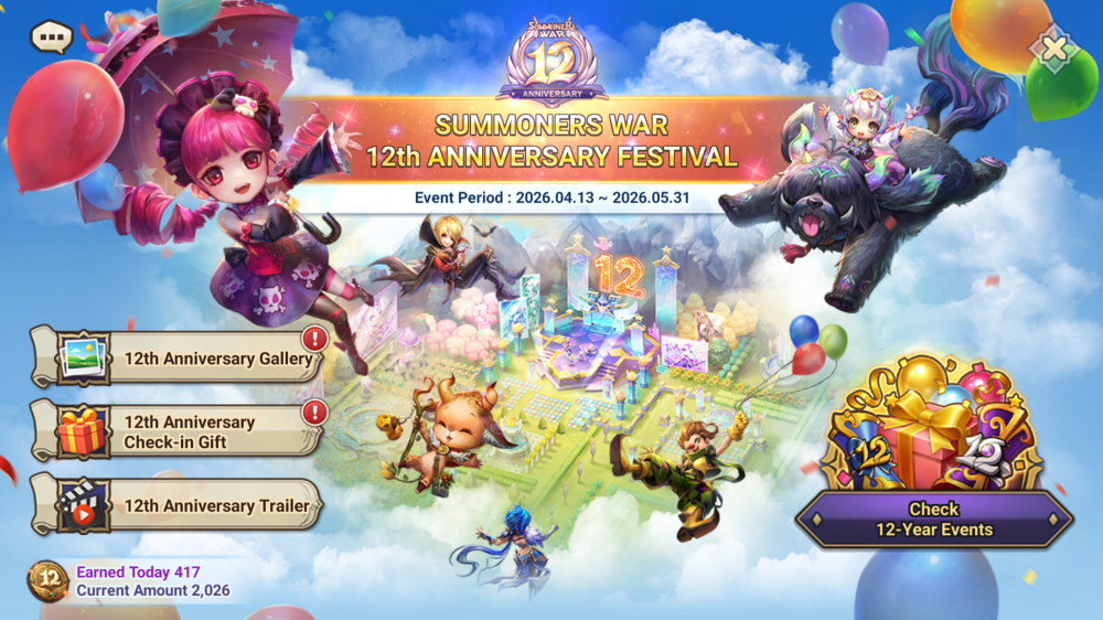 Greetings from the Summoners War Dev Team!Every time the year turns and spring arrives, we find ourselves looking back at the time we've shared with you.Spring is an even more grateful season because it reminds us of that fact.On April 17, Summoners War celebrates its 12th anniversary.We believe Summoners War exists only because of the love and support you have shown us over the past 12 years.In today's Developer's Note, we would like to introduce the 12th Anniversary Festival and the accompanying update details we have prepared for this milestone.But first, check out the link below for a teaser video for the 12th Anniversary Festival.\[▶ Summoners War 12th Anniversary Teaser Video ◀]Now, let us walk you through the changes coming to Sky Island for the 12th anniversary.Here is the news regarding the 12th Anniversary Festival.■ Summoners War 12th Anniversary Festival - Event Period: Apr. 13 - May 31▶ 12th Anniversary Stage and Visuals on Sky IslandAlong with a stage celebrating the 12th anniversary, Sky Island will feature display panels, fireworks, and laser effects to add festivity.On the stage, you can watch performances by Valkyrja, Hell Lady, Chakram Dancer, Boomerang Warrior, and Assassin in their Idol Star Transmogrifications. We have decorated Sky Island so that the lively performances of these Monsters, combined with massive display panels, allow you to enjoy the anniversary vibe.The lineup on the stage will change at regular intervals during the festival, showcasing various performance motions. We hope that watching which stage the Idol Star Monsters present will add a small joy to your gameplay.▶ 12th Anniversary Special Mermaid TransmogrificationThe special Transmogrification we prepare every anniversary has arrived again this year.The winner of the 12th Anniversary Transmogrification is Mermaid, transformed into a special look fitting for the celebration.The name of this Transmogrification, featuring Mermaid sitting atop a mysterious moon-like object, is "Lunar Star." It will be provided through a 12th anniversary event, so don't miss your chance to obtain it. Furthermore, Lunar Star Mermaid is also scheduled to appear on the 12th anniversary stage. Check out Mermaid in its Transmog first and then again on the stage.▶ 12 Decoration Items for the 12th AnniversaryTwelve different decoration items that capture the festival spirit will be added to the Shop.The stage-shaped decoration item in the center of the image is particularly noteworthy.This item is a special placement building where you can place one Monster of your choice, and you can purchase up to three to install on your Sky Island.In particular, if you place Monsters appearing on this year's anniversary stage—such as those with Idol Star Transmogrifications or the 12th Anniversary Mermaid—in this building, they will perform with exclusive animations.Try out these diverse, festival-themed items to make your Sky Island even more spectacular.We look forward to seeing your wonderful decorating skills.▶ Diverse 12th Anniversary EventsWhen you touch the stage building mentioned above, a dedicated 12th anniversary space will open,allowing you to conveniently enjoy 12th anniversary events and content in one place.Here is a brief introduction to what we have prepared.\[12th Anniversary Gallery]A special gallery of Summoners War awaits you. The gallery is filled with a variety of content, including never-before-seen concept art and stories of Monsters! New content will be revealed every day, so you can look forward to seeing what's new each time you log in.\[12th Anniversary Check-in Gift]You can earn various daily rewards by checking in every day during the 12th anniversary period.Don't forget to visit and claim all your gifts.\[12th Anniversary Cinematic Trailer]We have prepared a special cinematic video to celebrate the 12th anniversary.The trailer is available for you to re-watch anytime within the building, so please sit back and enjoy!You can also jump directly to the 12th anniversary event page or check the amount of event currency held on the main page.Various rewards are available in exchange for the event currency during the festival period.Detailed information about the 12th anniversary special events will be announced separately on April 10 KST.We appreciate your patience as we finalize these exciting events.That concludes the news for the 12th Anniversary Festival.We hoped to repay your long-standing love with various things to see and do on Sky Island.We would also like to share the details of the updates we have prepared. Let's move on to the update news.■ Summon Mileage SystemA Summon Mileage system will be added, bringing you one step closer to summoning a default 5★ Monster with every summon.Summon Mileage accumulates whenever you use scrolls in the Summonhenge.Mileage is earned based on the type of scroll used, and once you collect 2,000 mileage,you will be able to summon a default 5★ Fire, Water, or Wind Monster.The types of