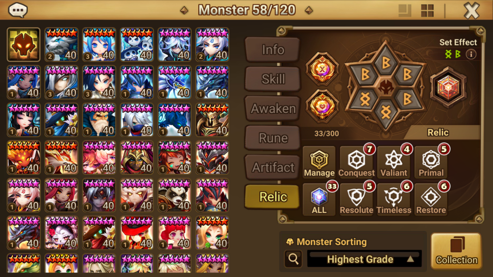 We believe many of you have experienced the disappointment of obtaining a great Rune or Artifact but only being able to engrave it on one Monster; Relics allow you to share the same effect among the Monsters you use without such restrictions.