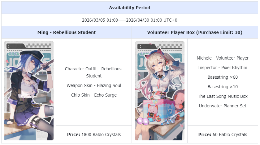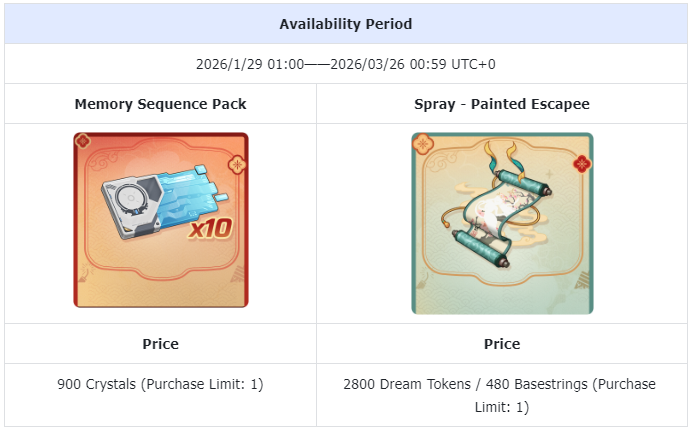 Dear Navigators:This month's version update will continue to adopt the \[zero-down time maintenance] mode.During maintenance, you can still log into the game normally and participate in matches, but the servers may experience brief fluctuations. We appreciate your understanding.After maintenance ends, the system will prompt you to \[Update the Game]. Please follow the instructions to update the client to the latest version. After updating, you can log back in to experience the brand new content.If you are in the middle of a match when maintenance ends, you will receive an \[Update Prompt] after the match concludes. Your gaming experience will not be affected.If you exit the game before maintenance ends and click \[Update] to re-enter after maintenance, you may be unable to reconnect to your previous match. We recommend planning your playtime carefully to avoid impacting your match experience.The maintenance duration may be adjusted based on actual circumstances. If an extension is needed, we will notify you in advance. Thank you for your understanding.▽ Update TimeJanuary 29, 00:00 – January 29, 07:00 UTC+0▽ ScopeStrinova Public Beta Servers▽ CompensationDream Token ×100, Basestring ×100▽ Update Content1. New SuperstringsNew Superstring: CielleCharacter Introduction: As a Duelist from Urbino, Cielle excels at close-range frontal assaults. She can charge at the forefront of her team, using her shield for protection to advance through hazardous zones and force defenders to retreat. When confronting overextended enemies, she can deliver devastating blows by combining her dash with shotgun fire. In stalemate situations, her enhanced ultimate skill allows her to tear through enemy lines like a sharp blade. To maximize her impact, players must fluidly switch between shield and firearms, plan their action routes carefully, and seize the perfect moment to strike.Role: DuelistActive Skill: Mobile ShieldDeploys an energy shield that blocks DMG. While the shield is active, you can charge forward. When the shield takes DMG, it restores your armor. When the shield is holstered, it gradually regenerates.Passive Skill: Auto ChamberAfter briefly holstering your weapon, it automatically reloads. Additionally, immediately after using a charge or manually detonating your shield, you can switch to your weapon quickly.Ultimate Skill: Absolute DefenseReinforces and refreshes the energy shield, increasing shield HP, reducing charge cooldown, and enhancing charge effects.Tactical Skill: Graviton BindThrow a destructible gravity orb that pulls enemies to its center, deals DMG on landing, and inflicts extra DMG to enemy summons.、2. Map Updates\[Festive Map Skins]The Spring Blessings is approaching, and we've prepared a special festive surprise for the battlefield! After this update, two maps—\[Area 88] and \[Snowveil District]—will temporarily receive Spring Blessings-themed decorations. We hope Navigators enjoy the festive atmosphere even in the heat of battle!3. Gameplay Updates\[Crystal Clash]The newly upgraded \[Crystal Clash] mode is officially here! This upgrade not only adjusts the gameplay but also introduces exciting new mechanics, offering Navigators a richer and more dynamic mining experience!\[Crystal Clash] evolves the former 7v7 \[Crystal Scramble] into a three-way 5v5v5 contest, creating a more unpredictable combat environment.A brand new crystal overload mechanic has been added, filling the mining process with surprises and unpredictability—a single mining attempt could yield a massive amount of resources!\[Crystal Clash] will take place on the freshly upgraded "Dirac Mine" map, a Bablo Crystal extraction site located on the border between untamed wilderness and the city. As competition over crystal resources intensifies, three factions once again stand in confrontation, and a fierce battle for resources is about to erupt!Please note that achievements for the Crystal Scramble mode cannot currently be progressed through Crystal Clash. Compatibility for earning Crystal Scramble achievements in Crystal Clash will be implemented in a future version.\[Outbreak]Random Event GameplayAt the start of each round, special events may randomly occur, altering certain game rules for that round and providing Navigators with a unique match experience.In-Game Card Recommendations for BeginnersAn in-game card recommendation feature has been added to reduce the difficulty of card selection for Navigators.Increased Energy Points for the Ultimate Skills of Meredith and Fragrans in Outbreak mode.Ming's primary weapon base DMG adjusted from 27 to 28.Flavia's primary weapon base DMG adjusted from 21 to 22.Fragrans' primary weapon base DMG adjusted from 22 to 23.All single-shot reload shotguns now reload 70% faster compared to standard modes.Zephyr Blade heavy hit wind-up increased by 60%; heavy hit damage adjusted from 800 to 900.Wave Break heavy hit wind-up increased by 60%; heavy hit damage adjusted from 900 to 1150.\[Map Workshop]In \[Es