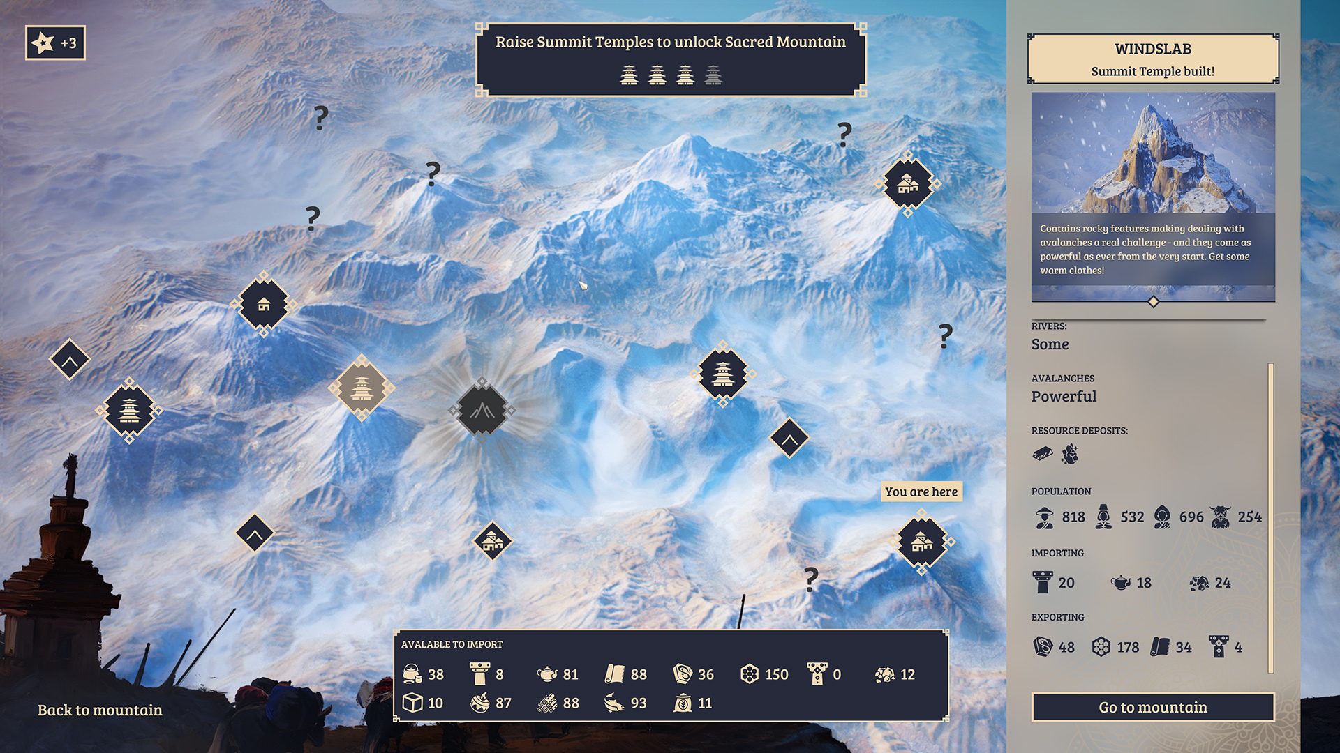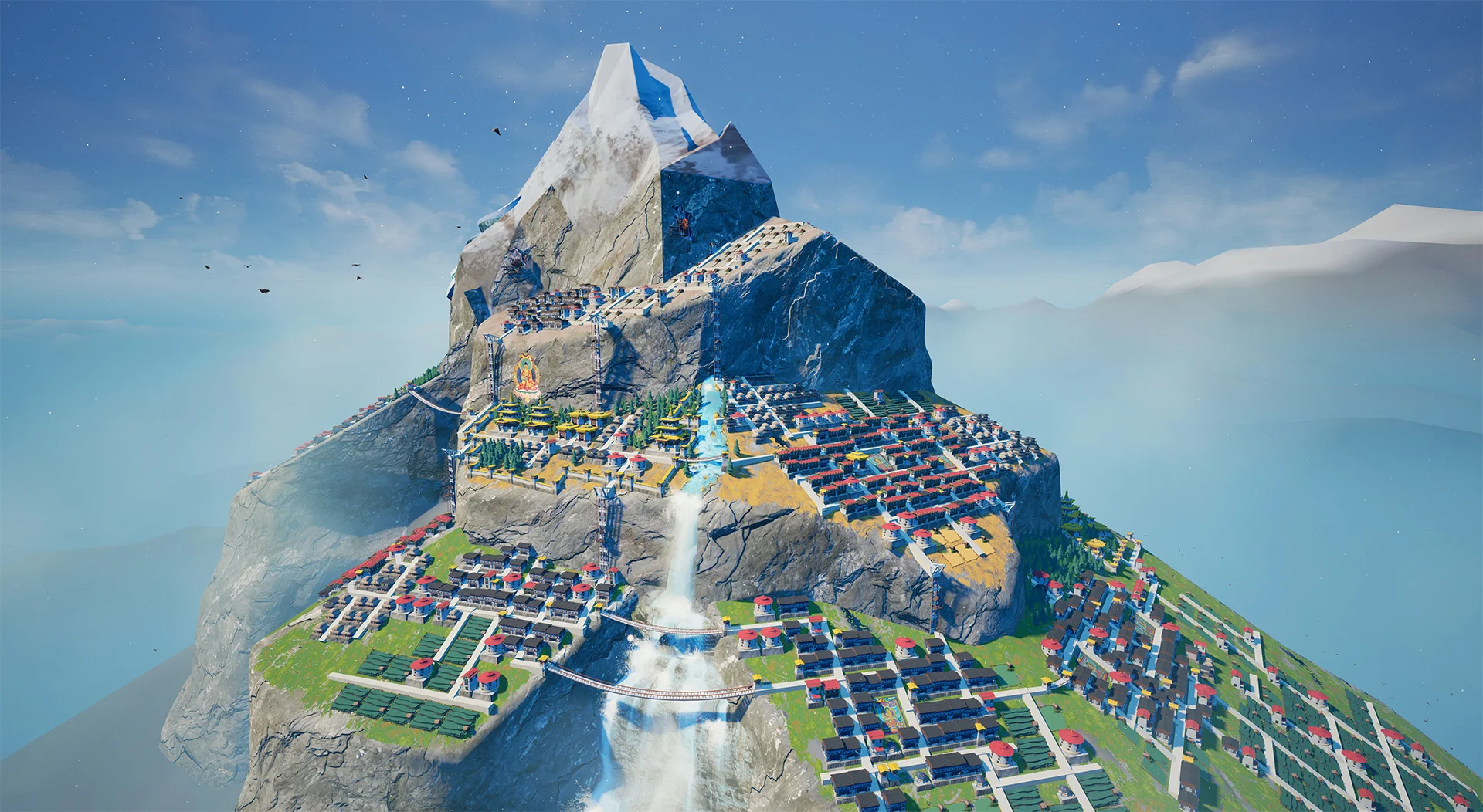 Then we introduced a Sandbox Mode, in which your playthrough is no longer contained to a single mountain: you create a trade network between multiple mountains, freely switching between towns. It allows you to focus on specialisation even more: not only can you have specialised districts on a mountain, but a whole mountain itself can be dedicated to a specific purpose.