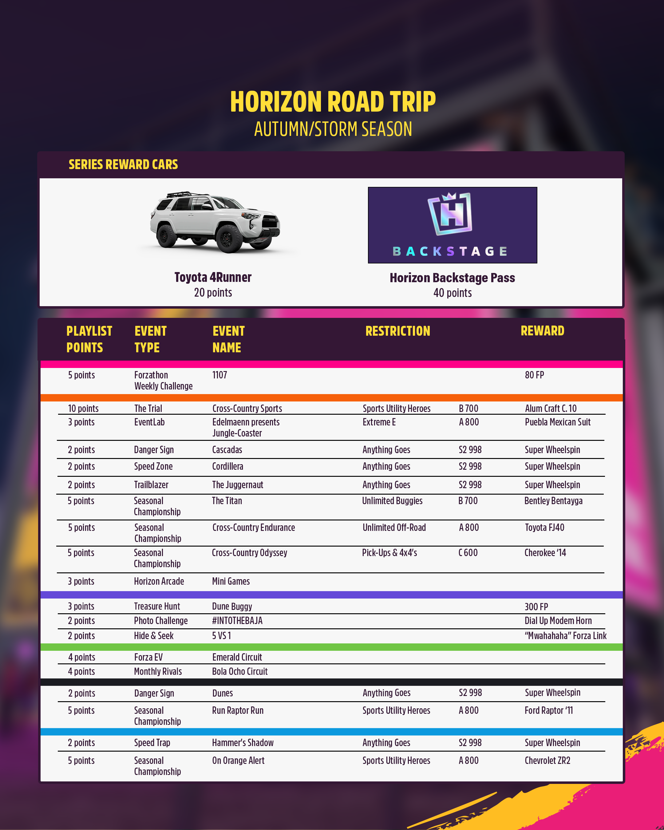 Bring your best off-road vehicle, we’re going Cross Country in the second week of the Horizon Road Trip! Here are the rewards available in the Autumn “Storm” season through April 9: 20 PTS: 2019 Toyota 4Runner TRD Pro 40 PTS: Backstage pass Celebrate the 1970 Volkswagen #1107 Desert Dingo Racing Stock Bug in the Weekly Forzathon and visit the Forzathon Shop to pick up the 2002 Ferrari Enzo Ferrari, the 2019 DeBerti Toyota Tacoma TRD "The Performance Truck", the Doodle Jumper and the Windows Tada Car Horn. Team up with your friends to master Horizon Arcade, then head into The Trial where you can score the 2015 Alumi Craft Class 10 Race Car. This week’s EventLab challenge courtesy of Edelmaenn is a Jungle Coaster with large jumps through Mexico’s jungle. Your reward? The Puebla Mexican Suit. Unlock a trio of Super Wheelspins in this week’s Seasonal PR Stunts – as well as a fourth on Hot Wheels Park – and take on Seasonal Championships to expand your garage with the 2016 Bentley Bentayga, the 1979 Toyota FJ40 and the 2014 Jeep Grand Cherokee SRT, the latter of which you can capture for this week’s Photo Challenge. Hot Wheels Park is no stranger to extreme driving and this week’s Seasonal Championship will keep you on orange alert while rewarding the 2017 Chevrolet Colorado ZR2. Remember that each week of the Horizon Road Trip features one Seasonal Championship featuring five racing events rather than the usual three, as well as another comprised of a single Goliath-type route that’s appropriate to the weekly racing theme. Last, but certainly not least, finish 30th or better in The Eliminator to win the “Mwahahaha” chat phrase for Forza LINK. Beyond the Festival Playlist, you can also score a 2019 Porsche 911 Carrera S by completing the Super7 Challenge. We’ll see you in Mexico for the adventurous Cross Country fun happening in Forza Horizon 5 this week.