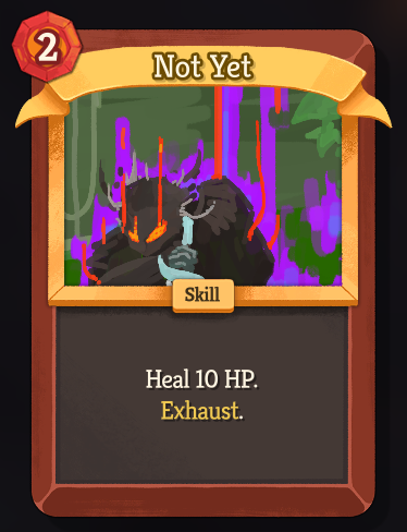 The Ironclad has received a new card, Not Yet: "Rare - Skill - Cost 2 | Heal 10(13) HP. Exhaust." Some other cards of his--Dominate, Expect a Fight, Spite, and Stoke--have received reworks, while Grapple has been deprecated. Numerous cards have seen buffs, nerfs, and rarity changes. Many of these changes have come with the aim of giving him better survivability and Exhaust synergies.