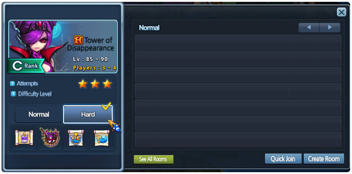 - The Difficulty of Tower of Disappearance will be separated into [Normal] and [Hard] Difficulty.