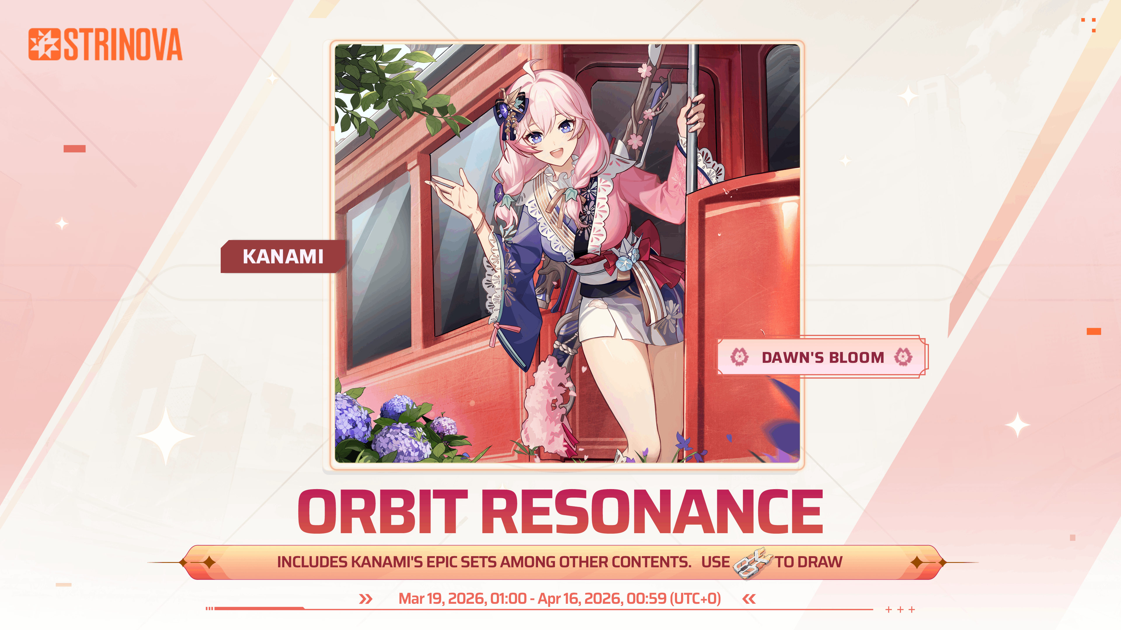 Orbit Resonance is open for a limited time. Navigators can use Resonance Sequence for a chance to obtain the Epic outfit \[Kanami - Dawn's Bloom], Epic weapon skin \[Crimson Sakura], and other Rare and Refined quality rewards.