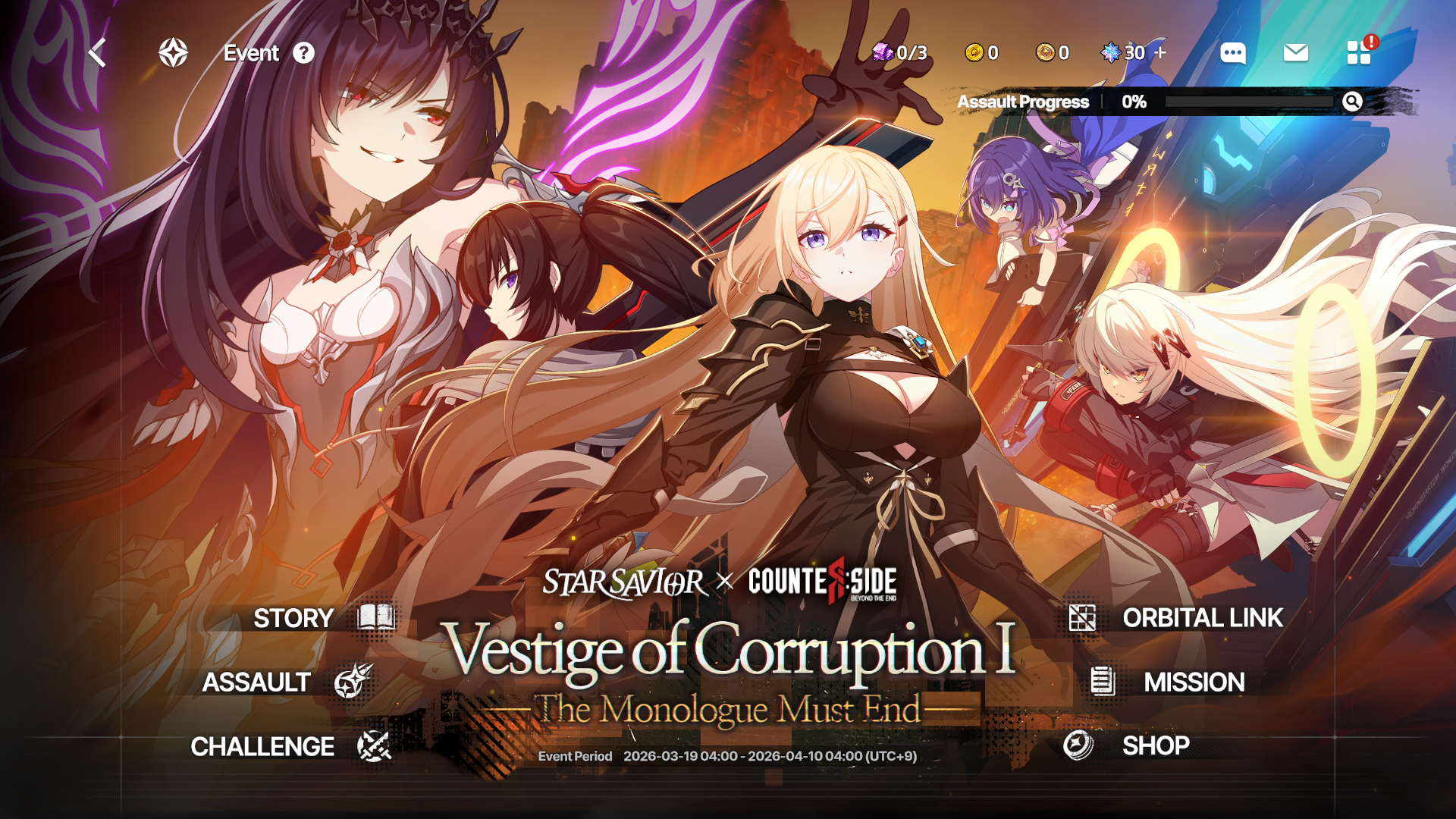 Guide your Star-kissed Saviors. StarSavior!Greetings, Captain! This is your Liaison Officer, GM Lisa.Below is the update announcement for March 26.▣ Maintenance Schedule: Mar. 26 01:00 - 06:00 (UTC) (5 hours)▣ Maintenance Impact: Game access will be unavailable during the maintenance.▣ Maintenance Compensation: 100 Stellagems + 5 Standard Savior Observation Tickets ※ The details in this patch note may be subject to change depending on the update status on the day of the update.Please check the game after the update for the most accurate information.1. Cosmo Gate Galaxy Season 1Cosmo Gate Galaxy Season 1 will begin.▶ Season Period: Mar. 26 01:00 - Apr. 1 19:00 (UTC)▶ Settlement Period: Apr. 1 19:00 - Apr. 8 19:00 (UTC) ※ Cosmo Gate cannot be played during the settlement period.In Galaxy Season 1, Hilde & Rosaria will appear as raid bosses.Challenge of the Stars will also be applied in Galaxy Season 1.2. EventA new event, Phase 2 of the 1st Vestige of Corruption, The Monologue Must End, will be unlocked under Main Lobby > Battle > Candle Square > Event.※ In this event, you can obtain various currencies by clearing Story, Assault, and Challenge stages.※ You can use the additional reward, Credits, in the dedicated shop to obtain items needed for growth.3. Cash Shop Product Sales- Some products will be available again in the Cash Shop.Check the details through the Shop menu on the left side of the Main Lobby in-game.4. Improvements and Changes▶ Some resources for Savior Hilde will be improved and updated like the following:Hilde’s Korean battle voice tone will be improved.Hilde’s face modeling and some facial expressions will be improved.▶ The difficulty of some Bingo missions will be reduced. The following missions will be adjusted:Before: Complete Journey 1 timeAfter: Claim NOA Support Fund 1 timeBefore: Clear any Event Assault stage 1 timeAfter: Clear Flash Point 1 time▶ The English level-up information text for Break Skills will be adjusted to improve legibility.▶ The English filter text in the Arcana inventory will be adjusted so that it no longer overlaps.▶ The English name and probability button for Guidestone will be adjusted so that they no longer overlap.▶ English nicknames in Strategy Battle will be adjusted so that they no longer extend outside the display area.▶ The English text in the timestamp in the Apocalypse Shop Daily Offer will be adjusted so that it no longer appears with an unintended line break.▶ The English reward text area in the Regional Dispatch will be adjusted so that it no longer overlaps.▶ The English rank text in the Gauntlet Season Info will be adjusted so that it no longer overlaps.▶ The English text alignment in the Operation Breakthrough Pass Vol.2 tab will be adjusted.▶ As the Guest Policy was added on March 19, the server account reset period will be changed back to 14 days.▶ The class-specific descriptions in Resonance Enhancement materials will be removed.▶ The information for the \[Rosaria] Savior that could previously be viewed in the Database will no longer be visible.▶ The information for the \[The End Wears the Face of a Girl.] Arcana that could previously be viewed in the Database will no longer be visible.▶ Experimental Multi-language Support AddedAn experimental multi-language support feature based on AI translation will be added.Some expressions may be awkward or inaccurate.Supported Languages: French / German / Spanish / Portuguese / Thai / Indonesian / Vietnamese5. Fixes▶ Fixed an issue where the red dot is reset and displayed again when selecting Orbital Link in a Story Event.▶ Fixed an issue where barrier indicators for allies and enemies are displayed in reverse on the HUD at the top of the Gauntlet screen.▶ Fixed an issue where hit voice lines continue to play when the magician inflicts sleep in Guild Defense.▶ Fixed an issue where the Star Link level is not applied to a Savior that first reached Lv. 200 on the device used for the initial installation.▶ Fixed an issue where a declined friend request remains visible and an error message appears when selecting Decline All.▶ Fixed an issue where the Claim button remains active after receiving 20 Friendship Points, and an error message appears when selecting it.▶ Fixed an issue where Orbital Link can be accessed before clearing Operation 1-5.▶ Fixed an issue where Flash Point’s Stage 4 is reflected in progress.▶ Fixed an issue where owned materials are intermittently displayed as 0 when selecting the Craft shortcut.\[Note]The schedule may change depending on the update status. If there are any changes, we will provide additional notice through this announcement.On mobile devices, reconnecting to the game may require data usage for the update download. We recommend using Wi-Fi.Thank you.