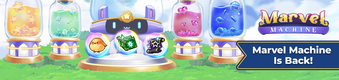 The Marvel Machine is back until Sunday, March 15 at 11:59 PM PDT / 7:59 AM CET (Mar 16) / 5:59 PM AEDT (Mar 7)! Marvel Ambassadors have searched far and wide for the most intriguing, attractive, and powerful items in existence, and now they're passing these relics on to you.See the full post on the MapleStory website!What prizes are waiting for you within the Marvel Machine? Tap and receive three glorious prizes with every Marvel, including the new additions below:Star Force 1-Star Additional Enhancement 100% (Lv. 200) and (Lv. 250)100% 17-Star Enhancement (Lv. 200), 100% 18-Star Enhancement (Lv. 200), 100% 20-Star Enhancement (Lv. 200), 100% 18-Star Enhancement (Lv. 160)Commander Control Chair, Dream Unicorn, Night PegasusI'm Catnip, Ryko Chair, Cherry Blossoms Chair, Corgi Rump Trampoline Chair, Report Received Chair, Train Trip Chair, Tiger Mouth ChairPermanent Pets with Advanced Auto Move skill: White Birdie, Amber Birdie, Polka-BirdieBerserked, Magic Eyepatch, Black Heart (30 Days), Dreamy BeltCursed Spellbooks (Red, Blue, Green, Yellow)Source of Suffering, Endless Terror, Commanding Force EarringMitra's Rage (Warrior, Bowman, Magician, Thief, Pirate)Weapons for Ren: Sweetwater Sword, AbsoLab Furious Sword, Terminus SwordYou might also find high-value rewards such as:Breath of Divinity RingFirestarter Ring CouponRing of Torment CouponLucid's Earrings CouponLightning God RingReaper's PendantAndroid HeartsGlowing Cubes and Bonus Glowing CubesLv. 160 Terminus weaponsLv. 160 Sweetwater equipmentLv. 200 Arcane Umbra equipmentNOTES:Marvel Machine codes can only be redeemed in Interactive worlds.See all the reward rates for the Marvel Machine here.